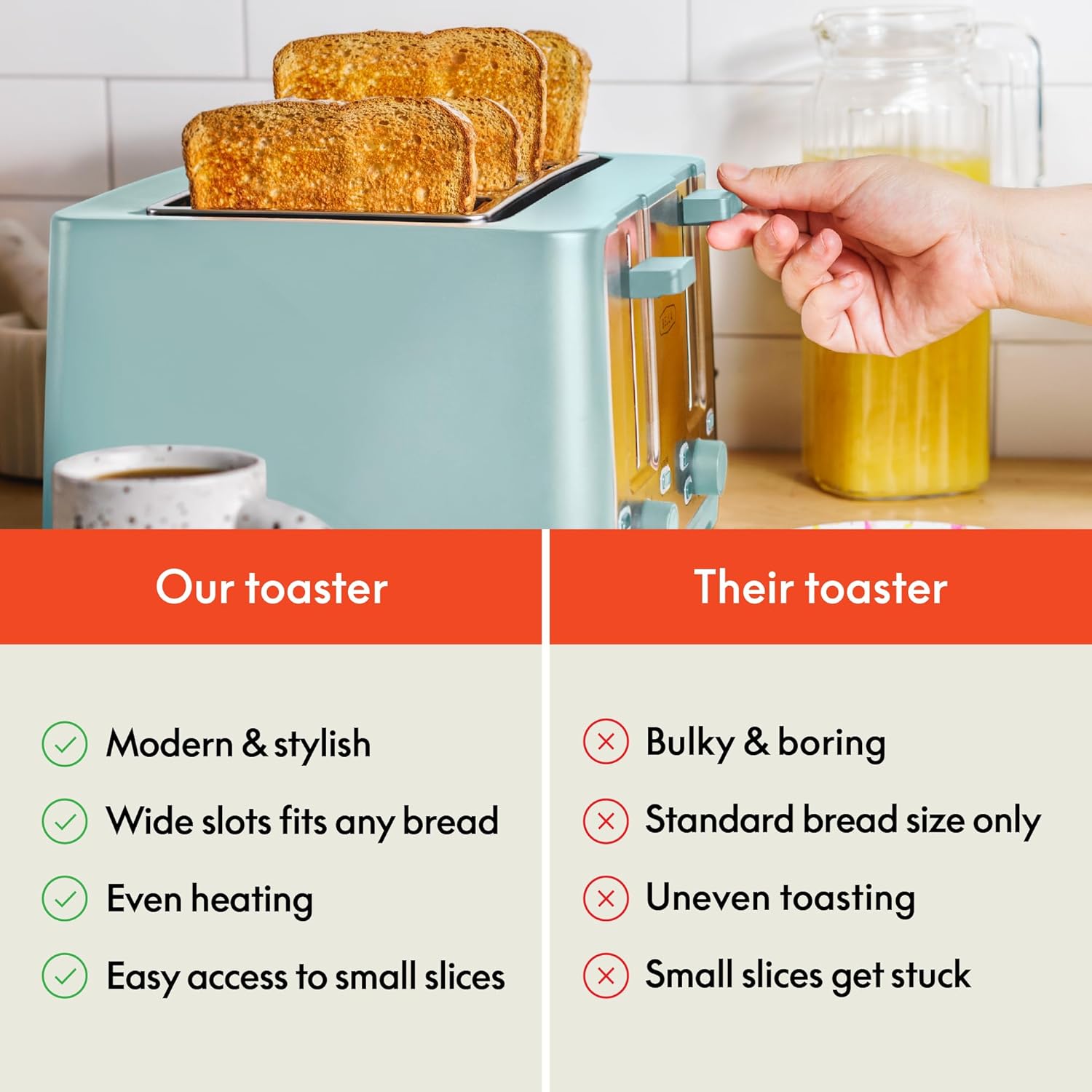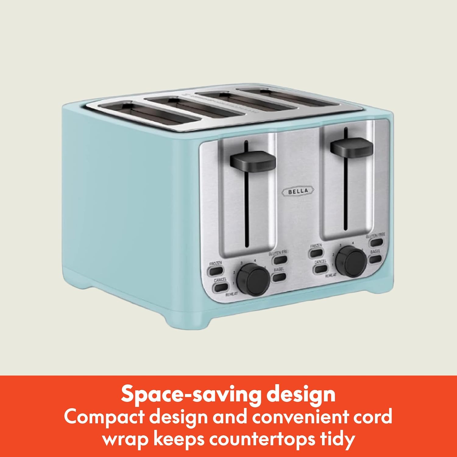 bella 4 Slice Toaster with Auto Shut Off – Extra Wide Slots & Removable Crumb Tray and Cancel, Defrost & Reheat Function – Toast Bread & Bagel, Stainless Steel and Aqua