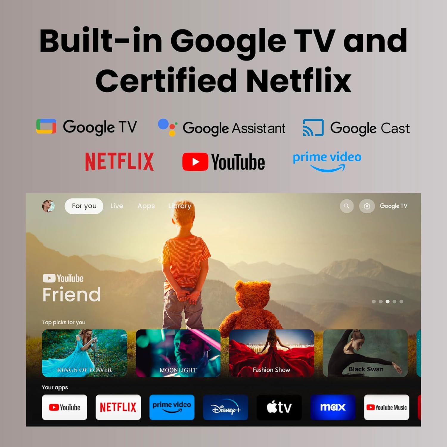 Google TV Built-InL Effortless Setup Anywhere, flexible multi-angle installation and smart image alignment ensure a big screen wherever you set up.Stream Netflix, Prime Video, YouTube, and more without external devices and experience seamless gaming with ALLM (Auto Low Latency Mode).