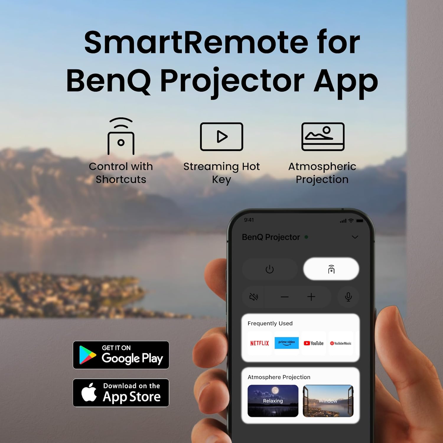 User controlling BenQ TK705i projector with SmartRemote app to adjust volume, apps, and streaming Control with BenQ SmartRemote App