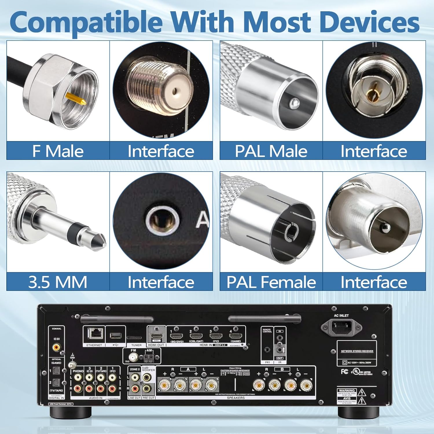 Wide Compatibility: Works seamlessly with indoor radio tuners, AV audio-video systems, home theater receivers, and stereo receivers, compatible with Pioneer, Onkyo, Yamaha, and Marantz etc.
