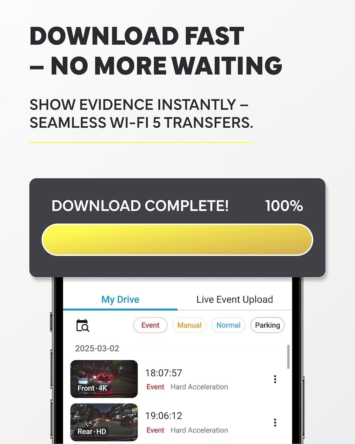 Smart Parking Surveillance with Pre-Event Recording – Automatically detects motion and impacts while parked, saving footage 10 seconds before events. Time Lapse mode and fast impact capture (1-second) provide reliable 24/7 monitoring. Hardwiring required
