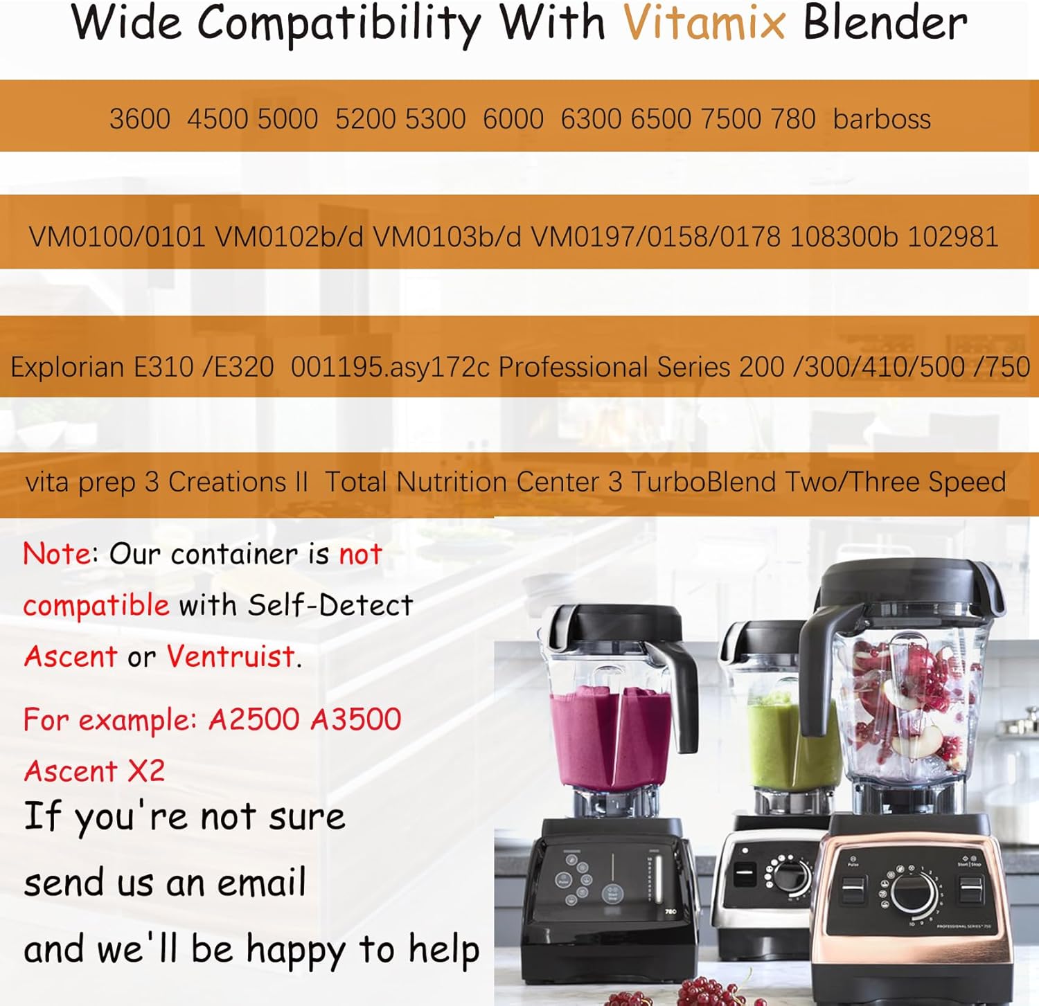 WIDE COMPATIBILITY WITH YOUR BLENDERS: 64OZ Low-Profile Blender Containers/Cups compatible with vitamix classic G/C/ commercial /explorian series blenders: 750 780 4500, 5000, 5200, 5300, 6000, 6300, 6500, 7500, 780, Explorian E310/E320, Professional Series 200/300/500/750, A 2300/2500, Creations II, VM0101, VM0102, VM0103, VM0109, VM0197.Note: Our container is not compatible with Self-Detect Ascent or Ventruist. If you are unable to confirm, please email us and we will be happy to help you confirm.