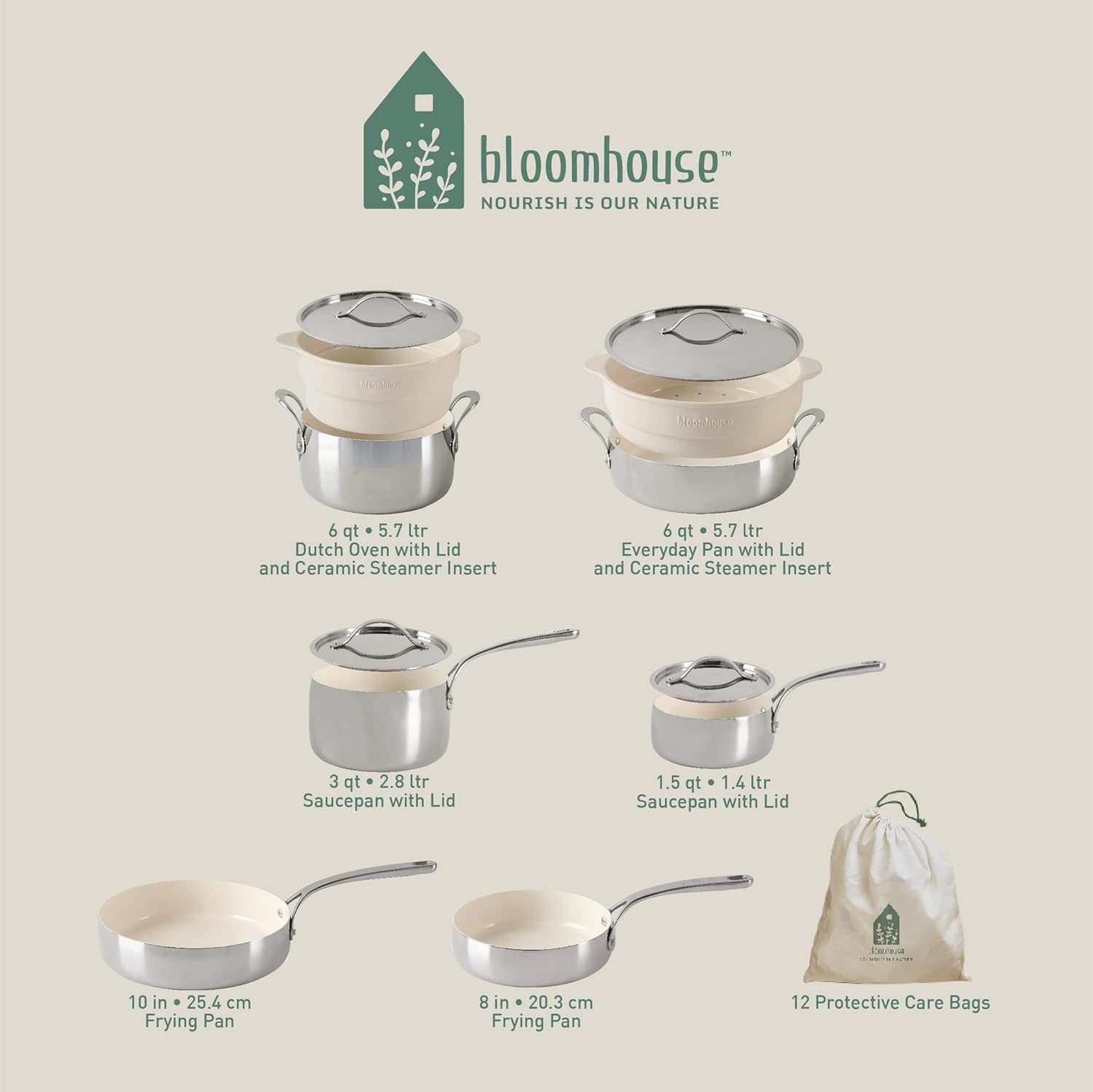 A health-driven, eco-conscious and artisanal-inspired suite of pots and pans, the bloomhouse™ 12-piece Stainless Steel Cookware Set with Ceramic Steamer Inserts lends a sense of abundance and beauty to any kitchen with full, round-shaped cookware – capturing the striking curvature of Colombian sculptures. Crafted from high-quality, 18/8 stainless steel, this set features a heat-responsive, base-to-rim aluminum core for efficient heat distribution to avoid cool spots and uneven results. The ceramic nonstick interior is made without PTFE, PFOA, PFAS, lead or cadmium to ensure safer and health-conscious cooking. Designed with Supreme Fusion Technology for long-lasting durability and everyday use, this non-toxic ceramic nonstick interior is 10x stronger than the standard coating typically found in ceramic nonstick cookware. The extended cast handles provide a safe and comfortable grip when lifting, transferring and serving. For healthier cooking styles, use the Cook-to-Serve ceramic steamer insert to prepare your favorite flavors in a manner you feel good about. Safe to use on induction, gas, ceramic, glass and halogen stovetops, our beautifully-crafted cookware will help you prepare meals for sharing and celebrating, while encouraging mindful lifestyle choices that nourish people and the planet. The stainless steel cookware are hand wash recommended and oven safe up to 500°F and the ceramic steamer inserts are dishwasher and oven safe up to 350°F. It comes with 12 protective care bags to store the pieces safely when not in use and to preserve the longevity for generations to come.