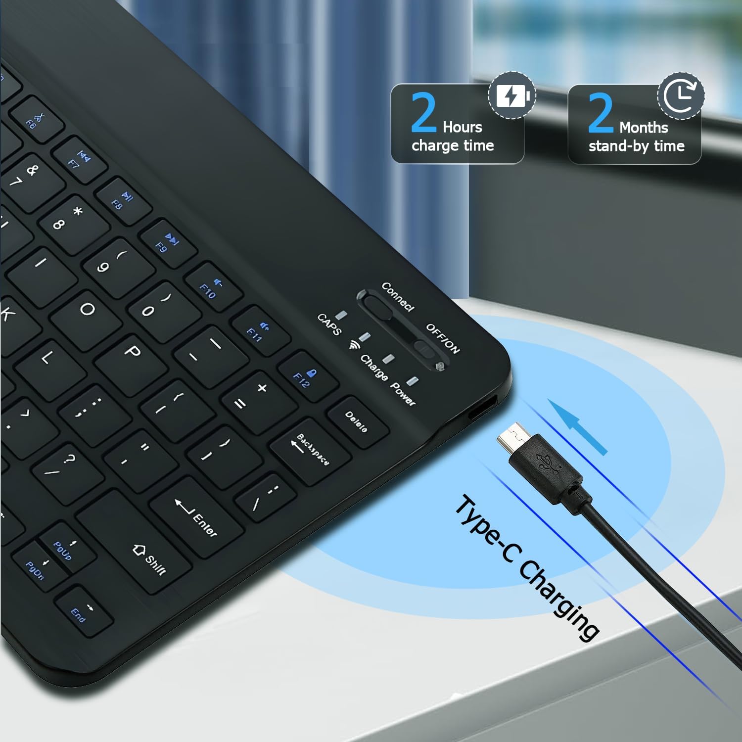 Bluetooth Keyboard has built in rechargeable lithium battery, one full charge can support 2 months standby time.