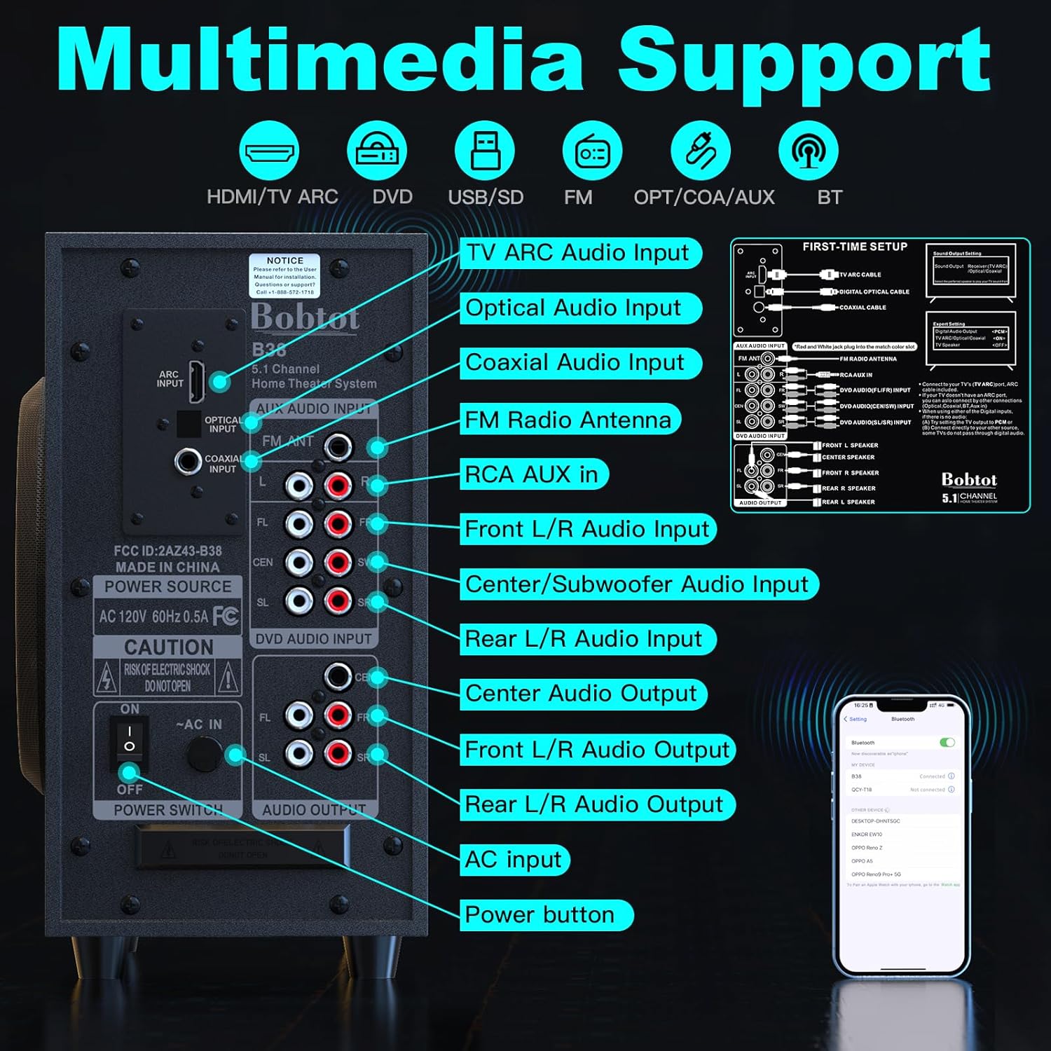 Bobtot 5.1 Surround Sound System for TV. From thunderous explosions to delicate whispers, this system captures the nuances and delivers them to your ears with fidelity. 5.1 and 2.1 channel, easily switch between them using the convenient remote control or the front panel on the subwoofer.