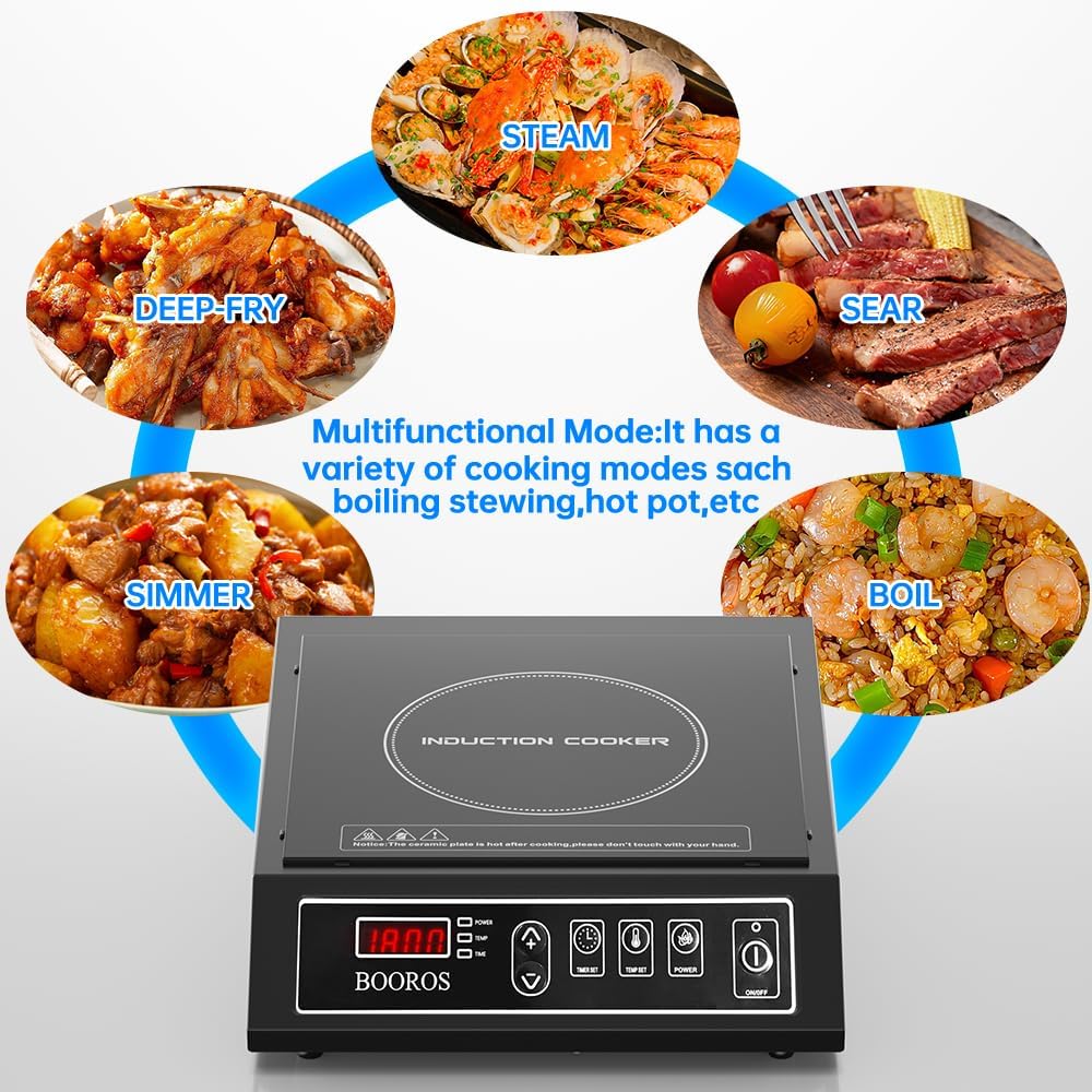 Super – Fast Heating: Powered by cutting – edge electromagnetic induction tech, the BOOROS Induction cooker cranks up the heat with 1800 watts. It delivers super – even heating,It can boil 2 liters of water in just 5 minutes, cutting your cooking time in half compared to regular induction stove.
