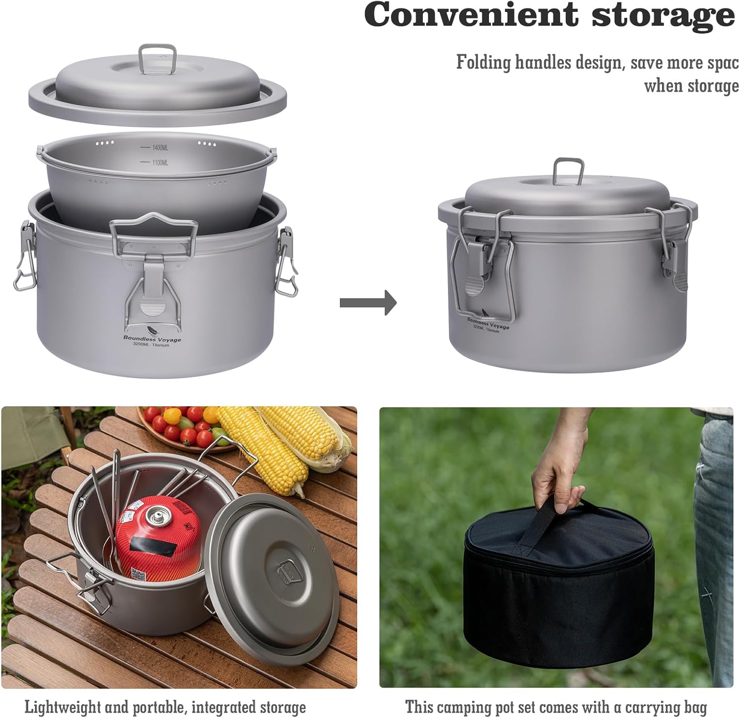 Compact cookware set: Folding handles design, save more space when storage. This camping pot set comes with a carrying bag. And the pot’s material is Titanium, It is more durable than other metals, while lighter than others.
