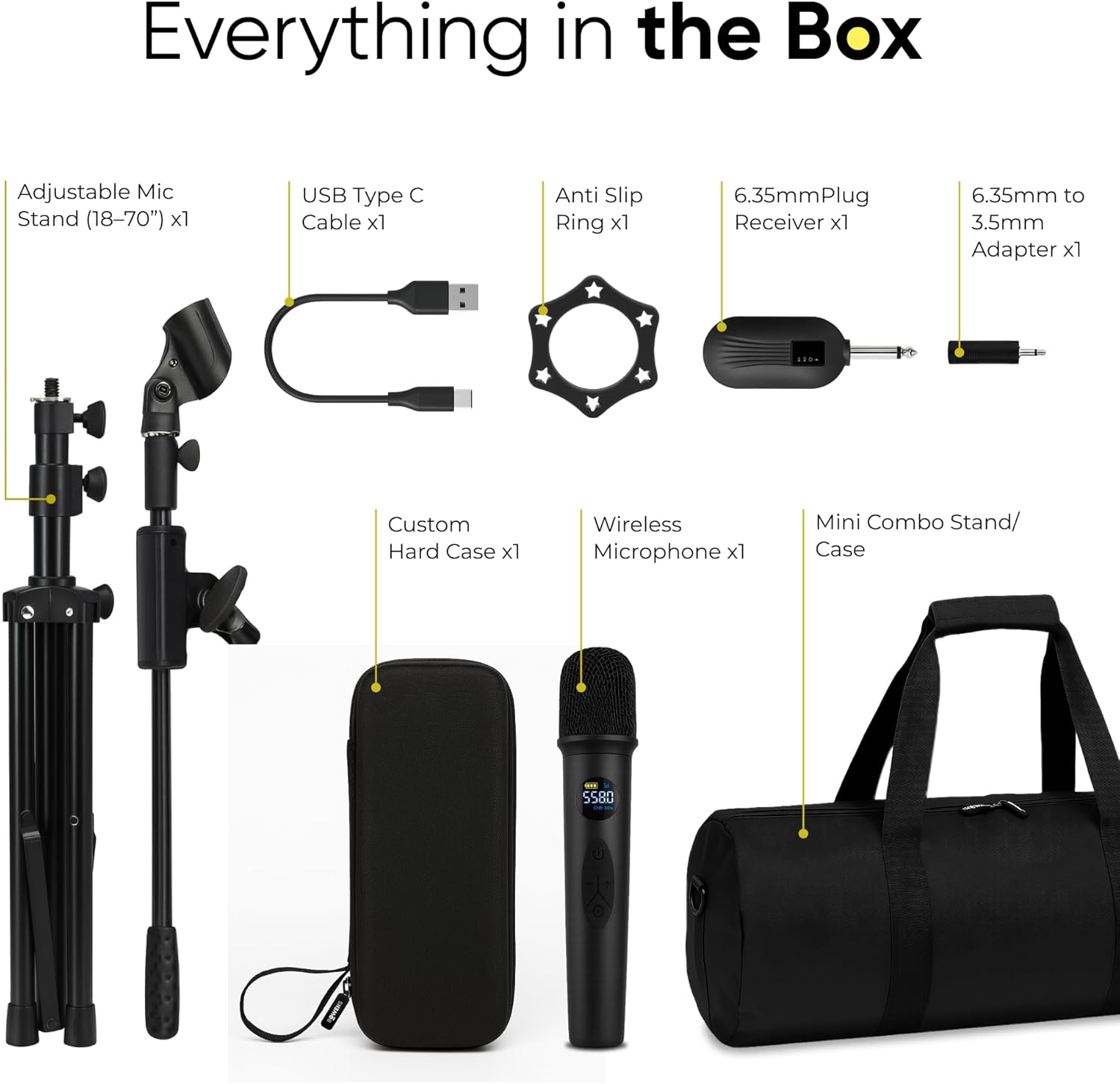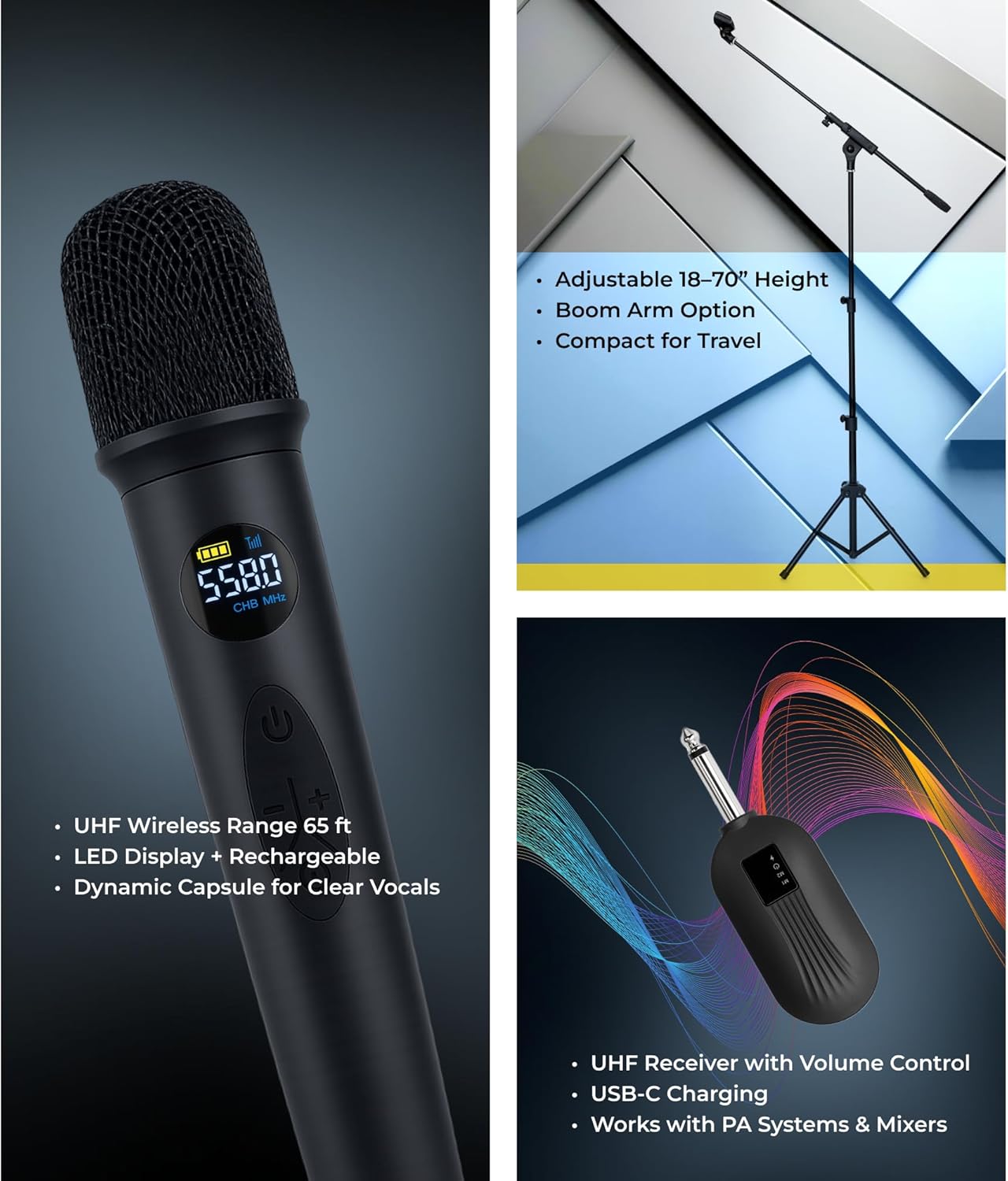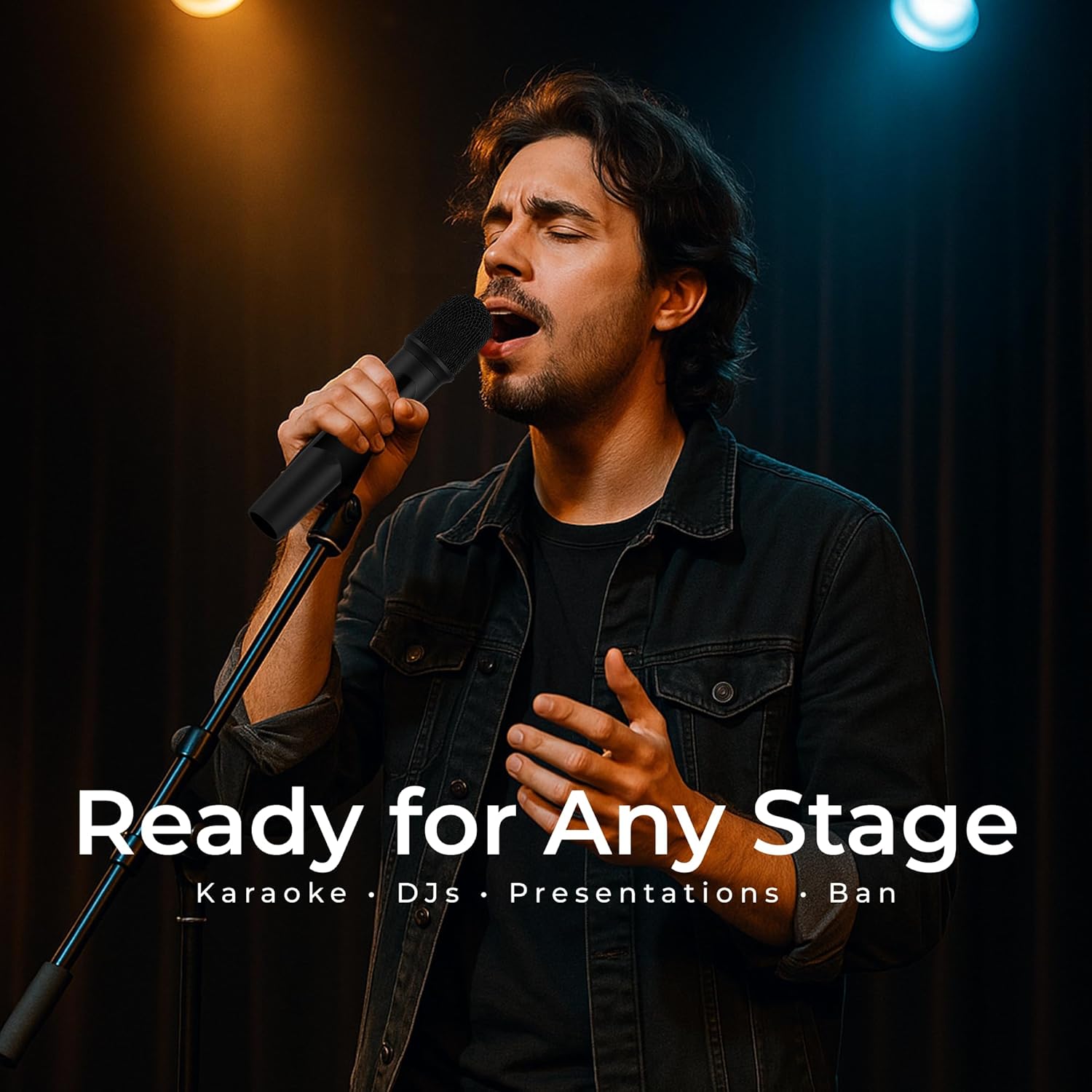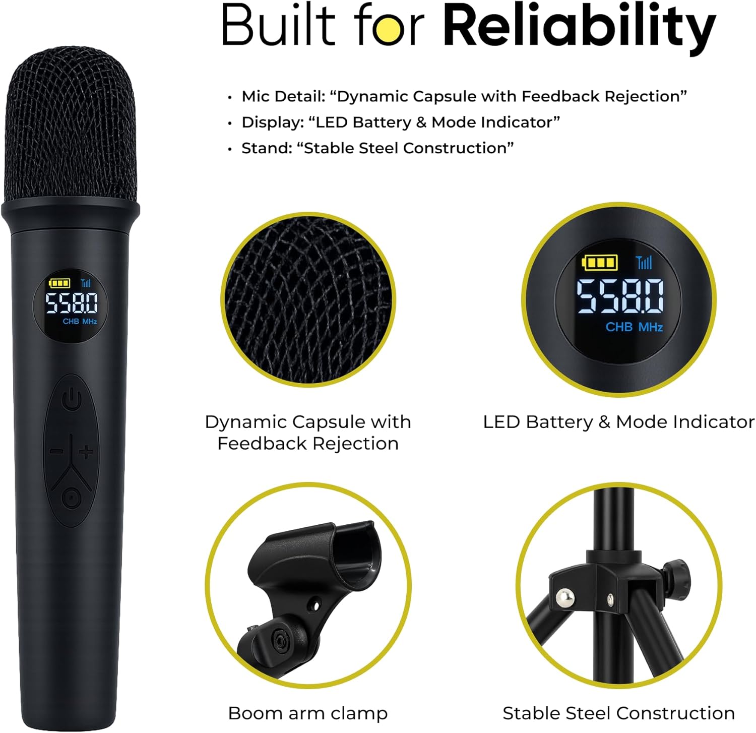 Includes a sturdy adjustable mic stand and a wireless microphone for karaoke. Built for microphone singing, delivering clear vocals and reliable signal for events.