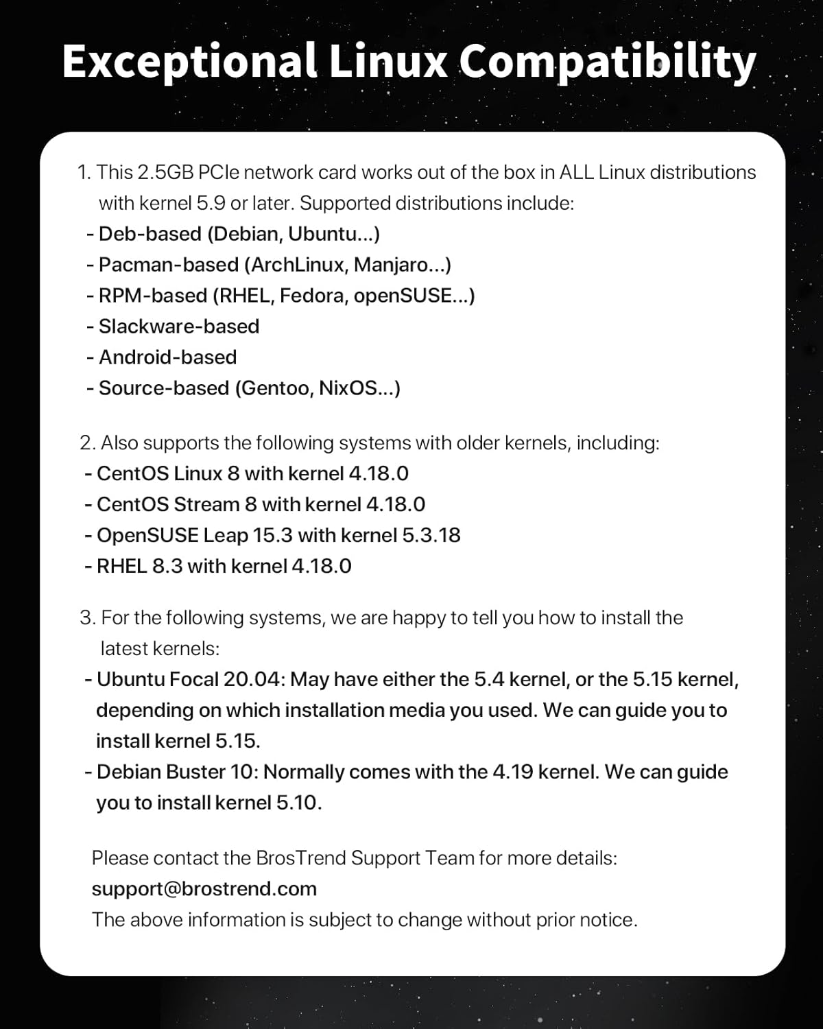 With Linux Support Ticket: We can also guide you to upgrade Ubuntu Focal 20.04 to kernel 5.15, Debian Buster 10 to kernel 5.10, to work with this PCIe network adapter