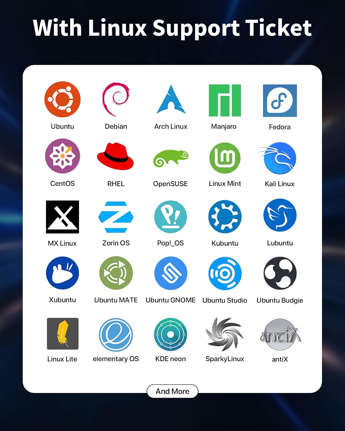 Exceptional Linux Compatibility: This PCIe network card works out of the box in ALL Linux distributions with kernel 5.9 or later. Supported distros include: Deb-based (Debian, Ubuntu…), Pacman-based (ArchLinux, Manjaro…), RPM-based (RHEL, Fedora, openSUSE…), Slackware-based, Android-based, Source-based (Gentoo, NixOS…) and MORE systems