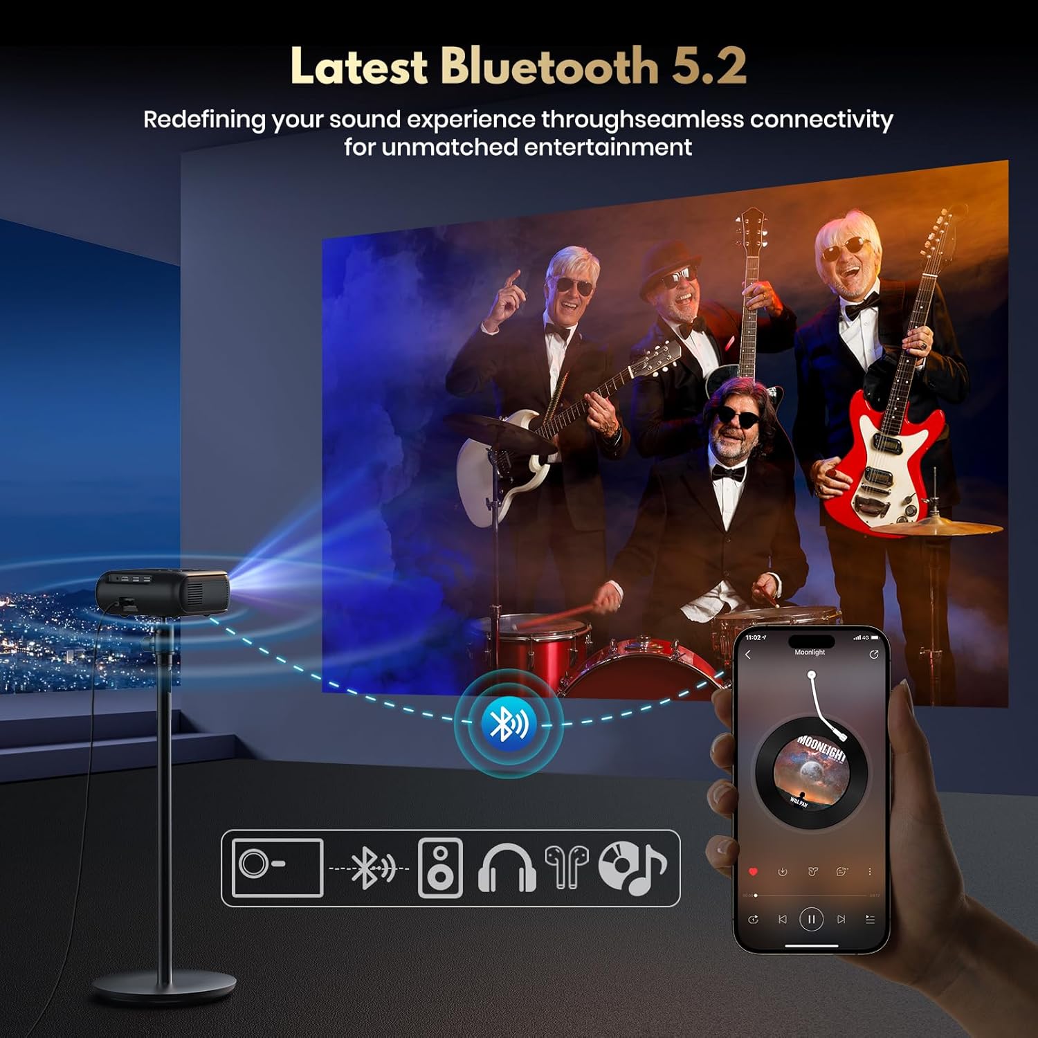 🎁【WiFi 6 & Two-way Bluetooth 5.2】 The X6 projector is equipped with WiFi 6 network module, which provides a powerful and versatile network connectivity experience with higher transmission rates, greater stability, and fewer network latency issues via dual-band 5G/2.4G WiFi. The projector supports two-way Bluetooth 5.2 audio transmission, which can be used as a stand-alone stereo speaker to connect with mobile devices, or paired with external Bluetooth speakers, headphones and other stereos to enhance the projector’s audio anytime, anywhere