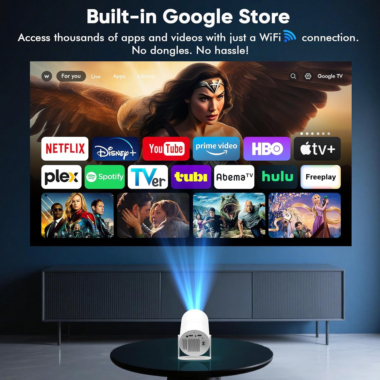 [Projector 4K with Built-in Google TV] Enjoy instant access to thousands of apps like Netflix, YouTube, and Prime Video—no extra streaming devices required. Just connect to WiFi and start streaming anywhere, anytime