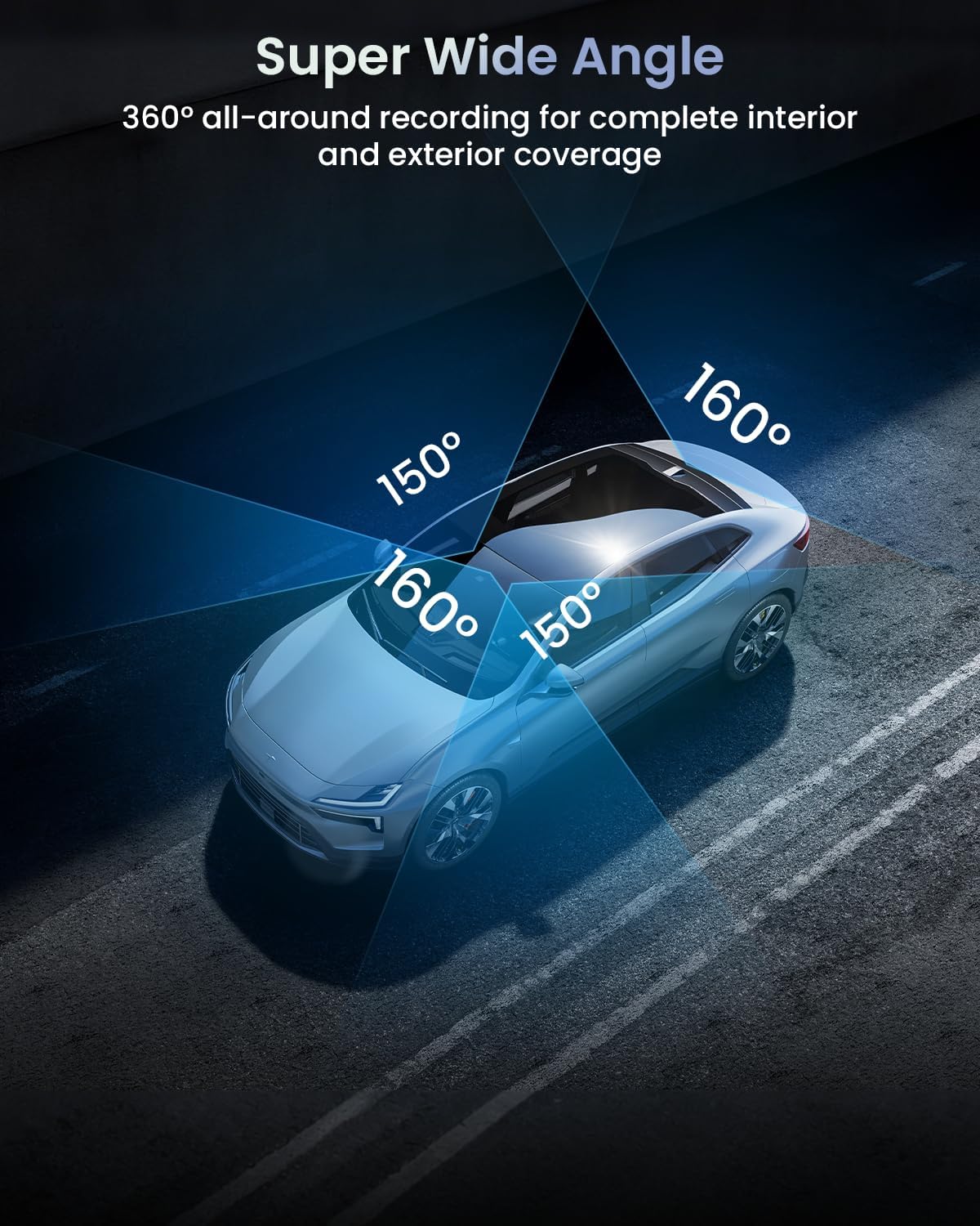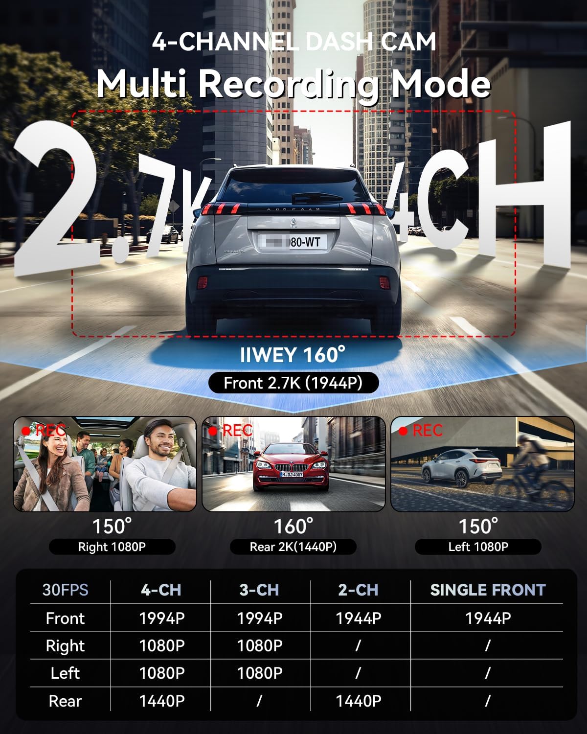 ⭐【4-Channel Dash Cam with 360° Coverage】 The IIWEY C4 PRO features a front camera with the premium IMX675 sensor, recording sharp 2.7K (1944P) video. The rear camera captures in 2K (1440P), while dual side cameras deliver 1080P, ensuring complete multi-angle coverage. Supports 1/2/3/4CH recording. With 160° front/rear and 150° side lenses, it eliminates blind spots and provides seamless 360° monitoring of every detail around your car.