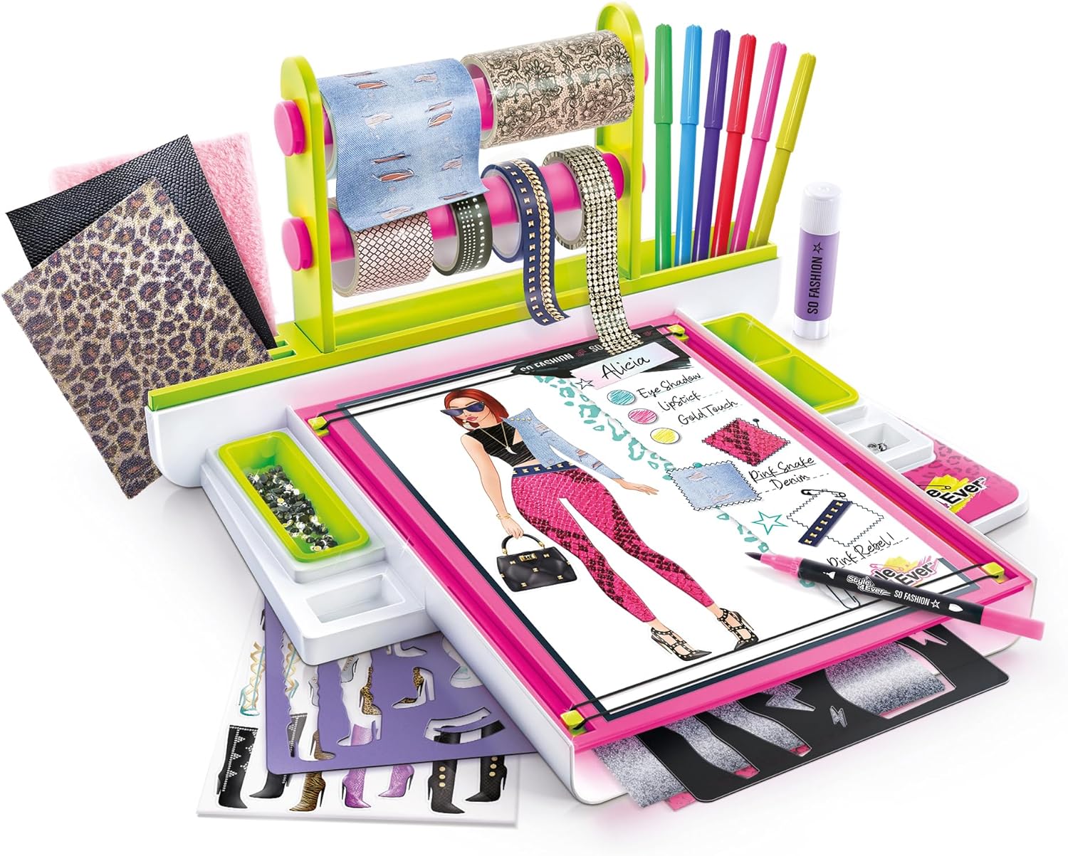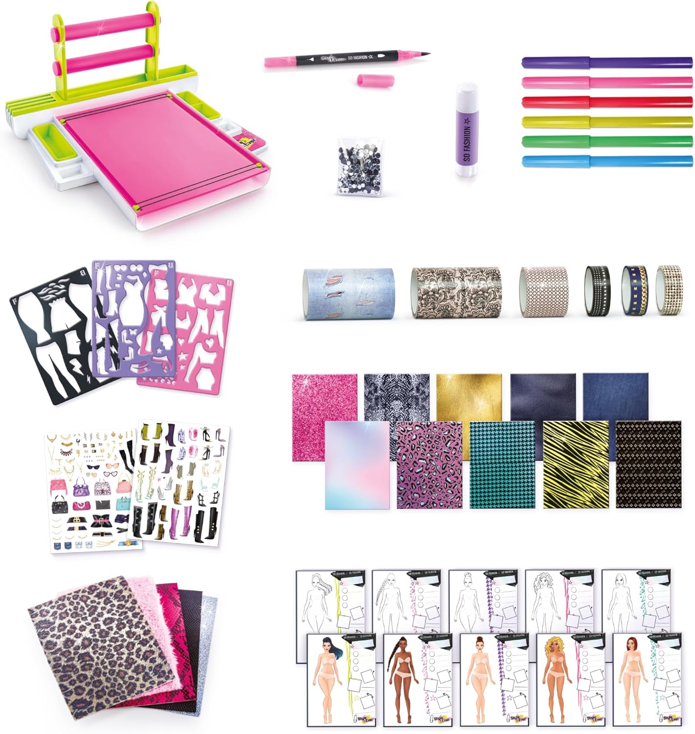 MANY ACCESSORIES INCLUDED: In this product you will find 1 studio, 1 double-tip marker, 50 gems, 1 glue stick, 6 markers, 3 stencils, 6 printed rolls, 2 sticker sheets, 10 printed sheets, 5 self-adhesive fabric sheets, 20 design sheets.