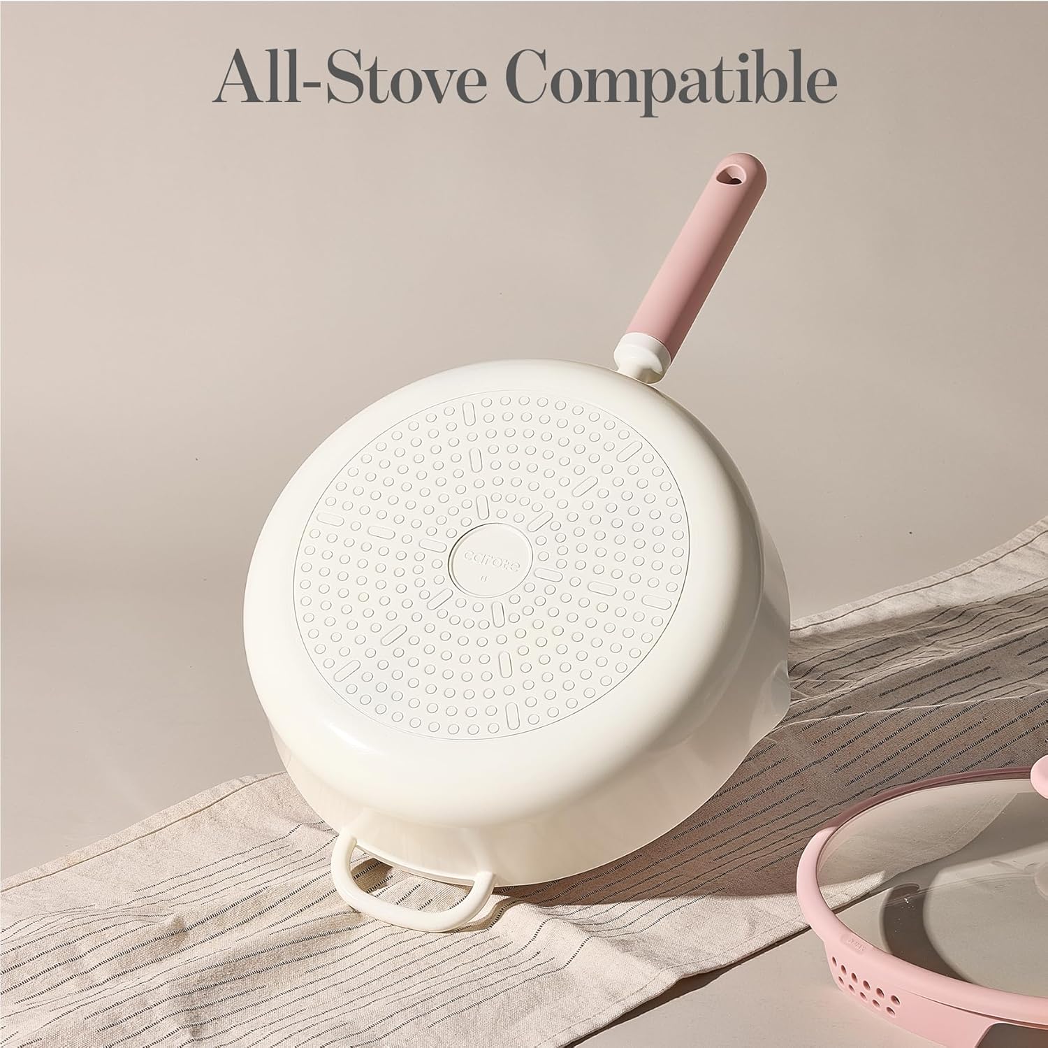 【Healthy & Non-Stick】Our Ceramic Saute Pan with lid features a natural ceramic coating, free from harmful chemicals such as PFOA, PFAS, PTFE, lead, and cadmium, making it healthy and non-toxic. Enjoy healthy, low-fat meals with minimal oil required.