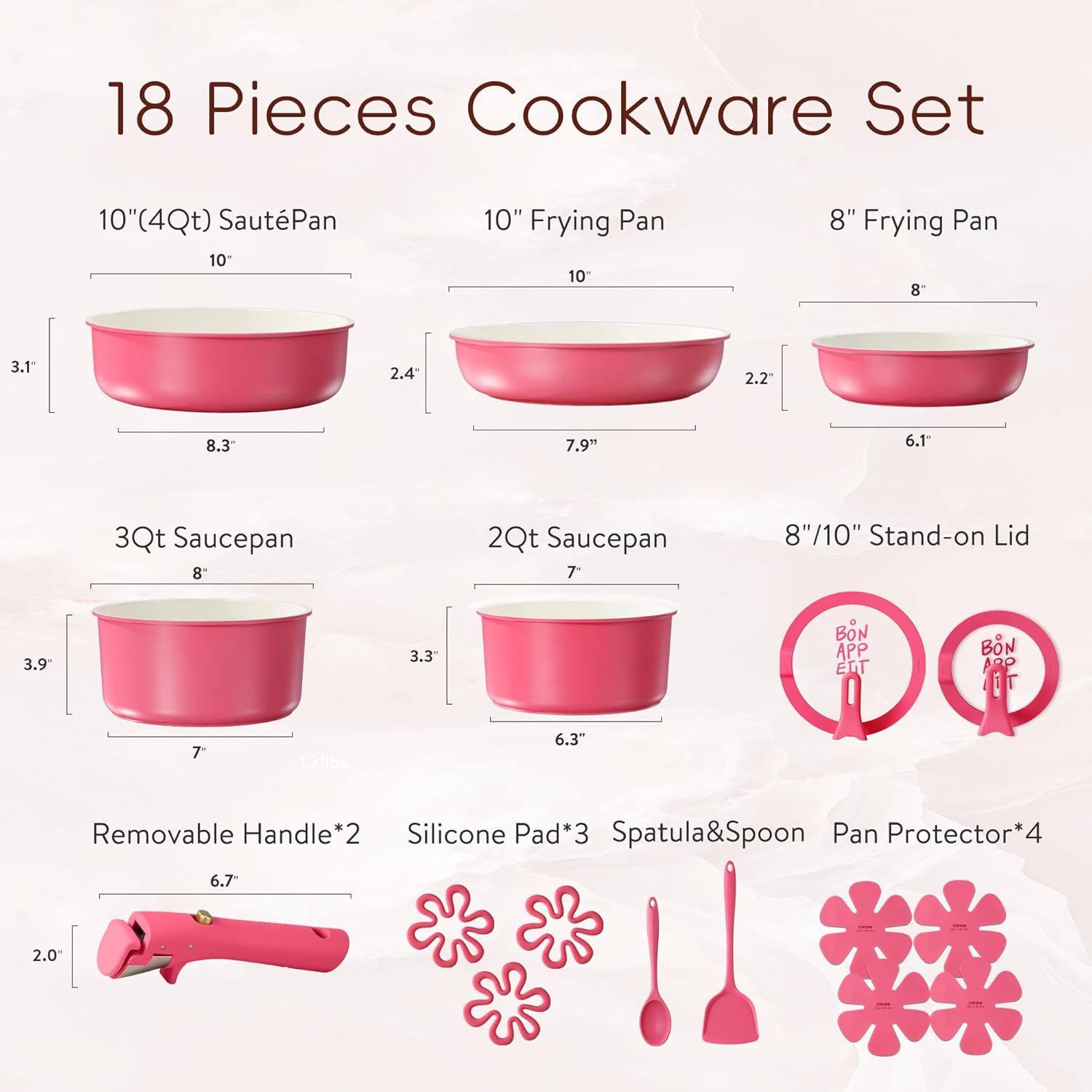 【Set Includes】8” frying pan, 10” frying pan, 10” sauté pan, 2-qt saucepan, 3-qt saucepan, 8”/10” stand-on lid, 2*detachable handle, 1*silicone spatula, 1*soup spoon, 4*pot protector and 3*silicone pad