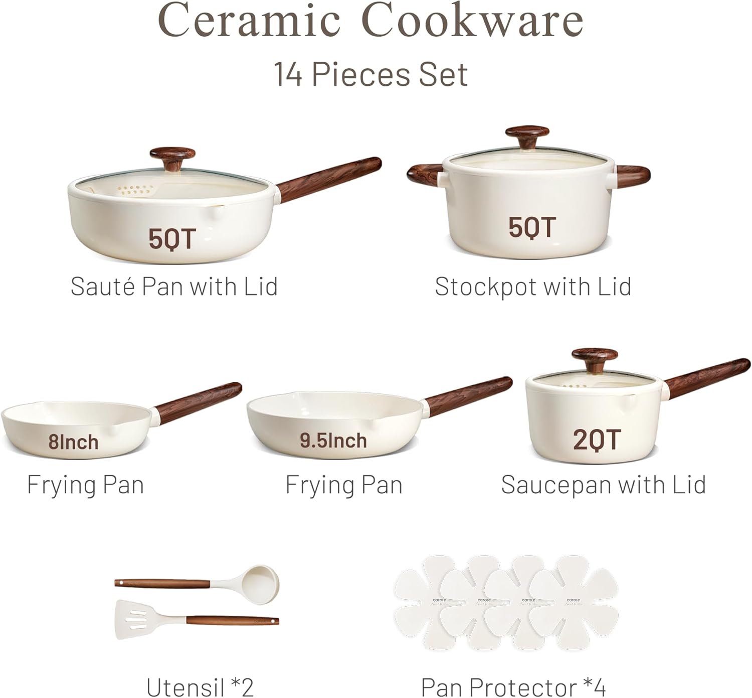 CAROTE Ceramic Cookware Sets, Pots and Pans Set Non stick, Non Toxic Healthy Induction Cookware, 14 Pcs Nonstick Kitchen Pots and Pans Set, PFAS PTFE Free
