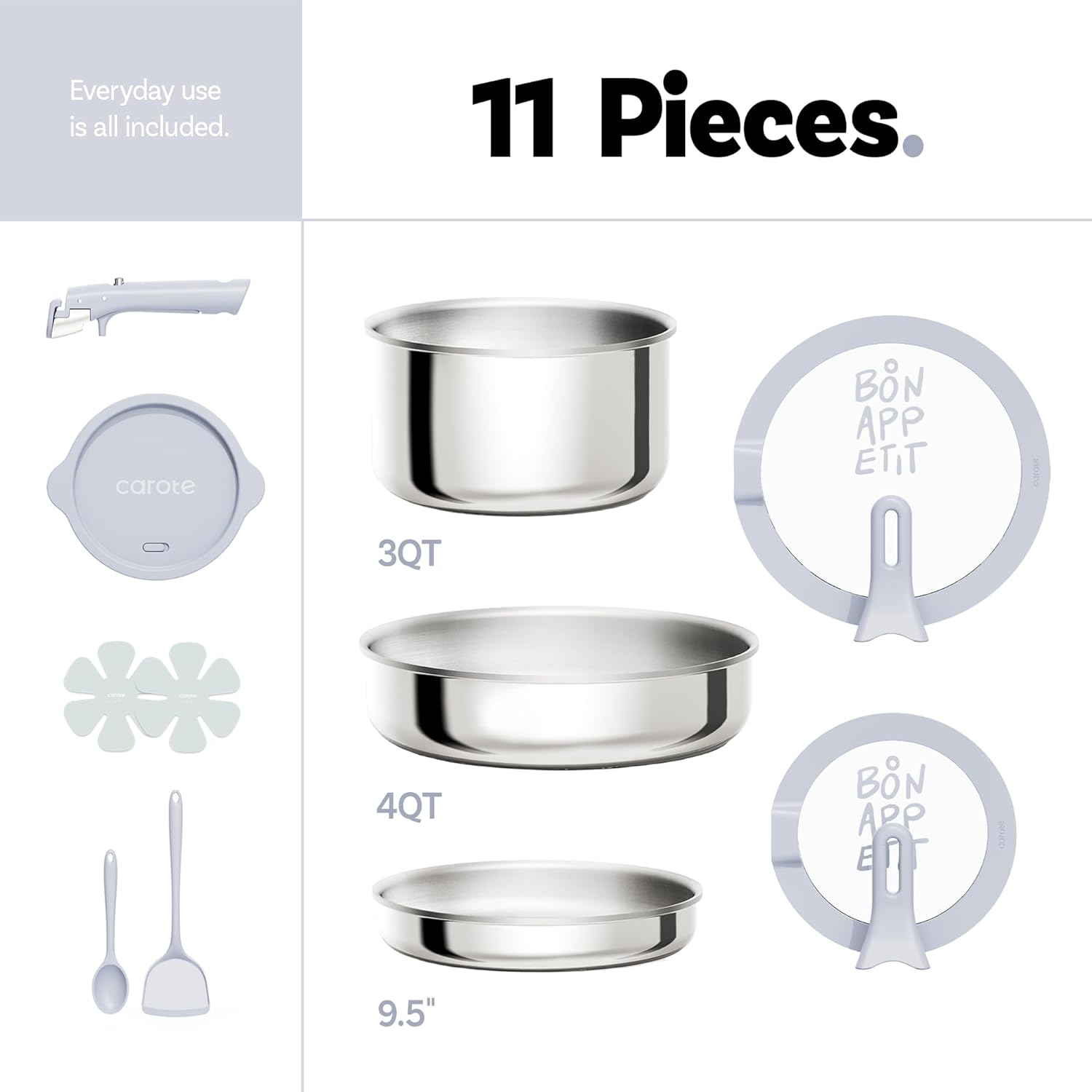 【Set Includes】4qt/8″ saucepan, 9.5″ frying pan, 4qt/10″ sauté pan, 8″ storage lid, 8″ /10″stand-up lid, 1*detachable handle, 1*silicone spatula, 1*soup spoon, 2*pot protector