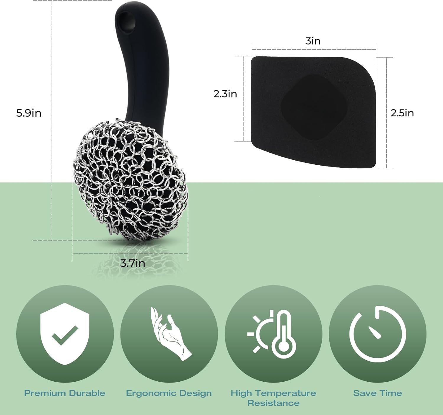 【1 SCRUBBER + 1 SCRAPER】: Cast iron scrubber is made of 316 stainless steel + silicone. Silicone has extreme stability, can resist high temperatures. Pan scraper is made of thickened ABS plastic, non-stick and non-cracking, heat-resistant up to 275 °F