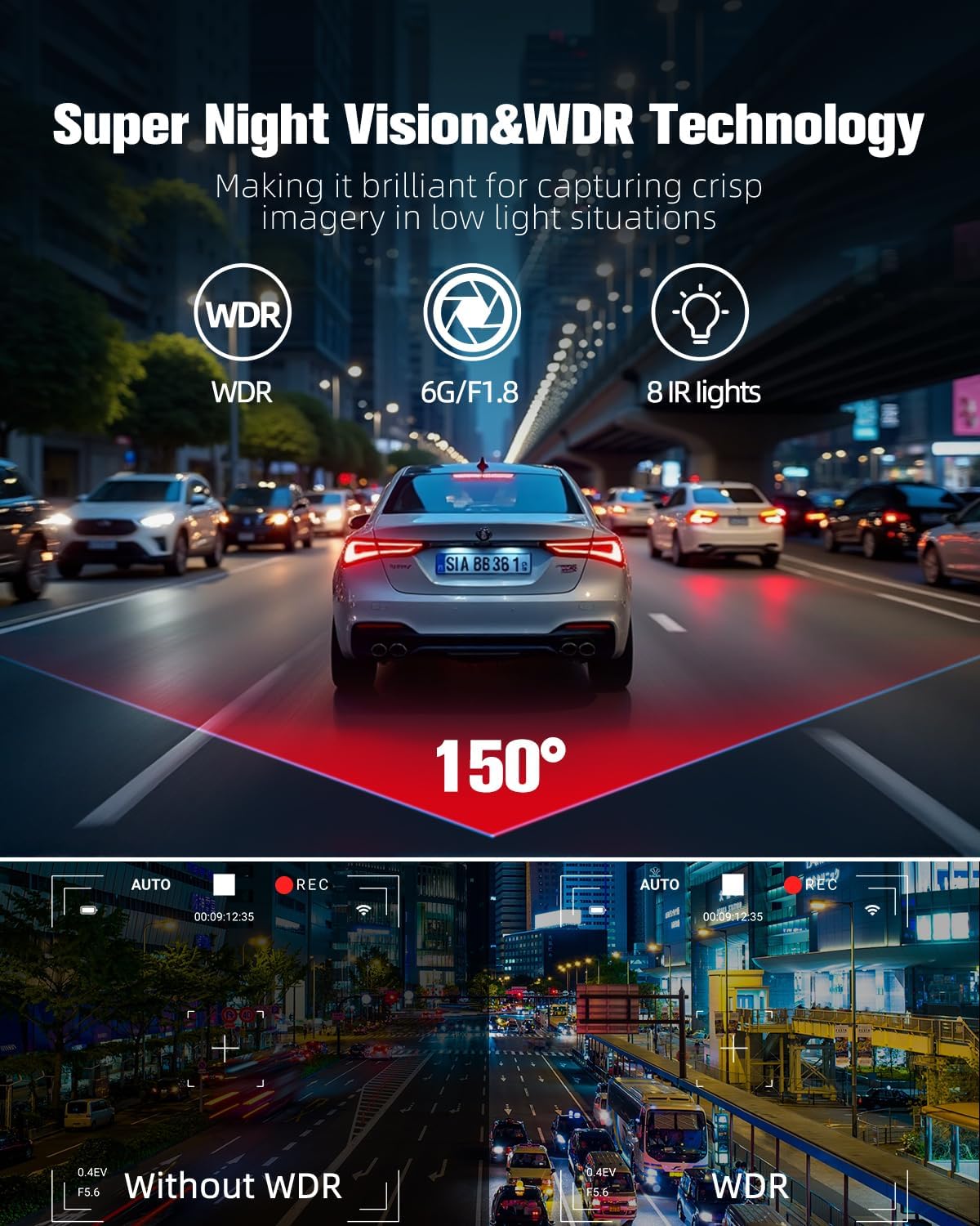 【Super Night Vision – See Darkness Differently】Outshine competitors with WDR tec, F1.8 aperture and 6-glass lens—capture license plates in pitch-black alleys or blinding highway glare. The infrared interior cam uses IR LEDs to record in darkness, while WDR Pro tech tames LED headlight halos for crystal-clear front footage.