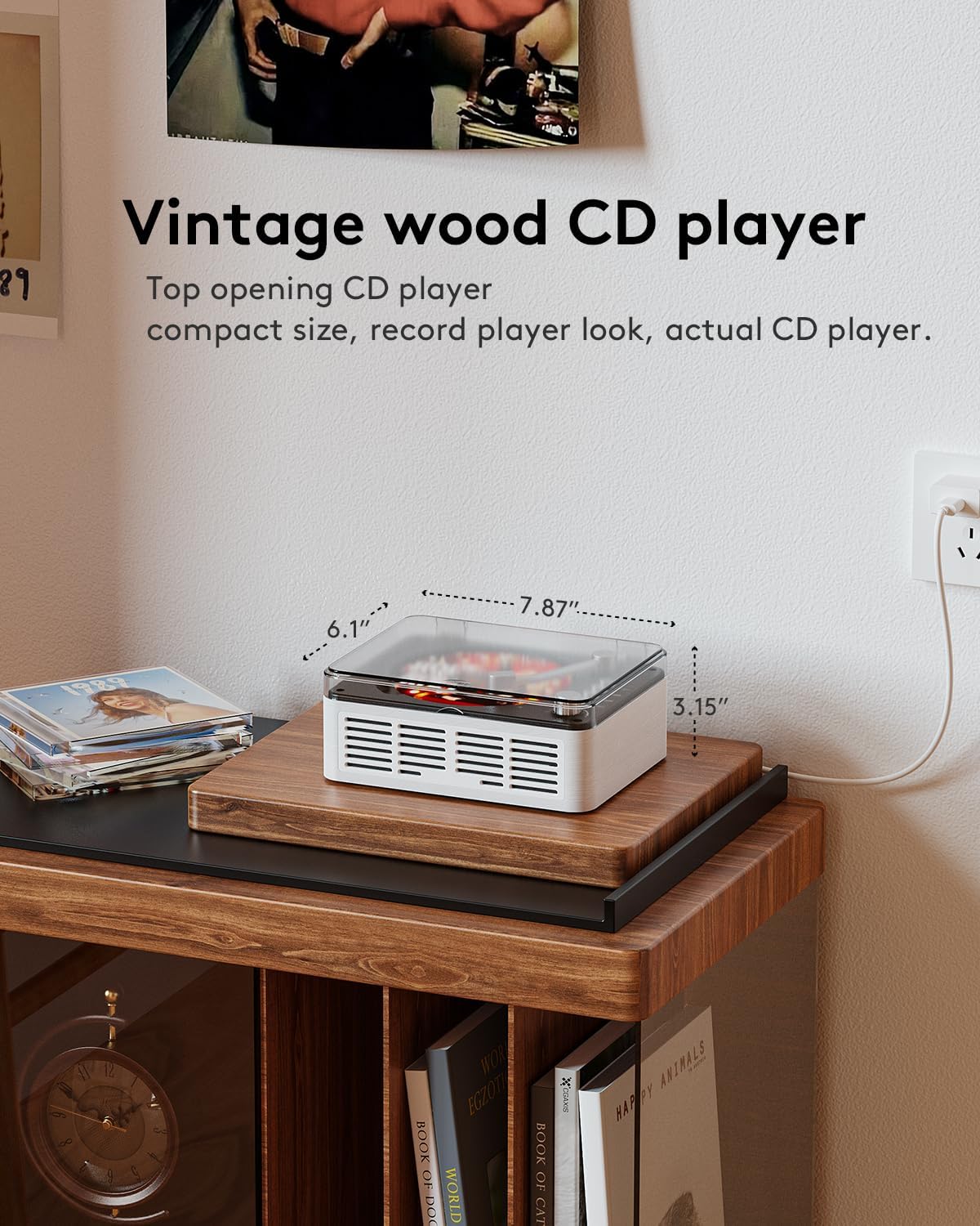 CD Player with Bluetooth Transmitter, Nostalgic Retro Wood Music Player, Built-in Speakers-Bass Boost, FM Radio for Home/Wired&Remote Control-White