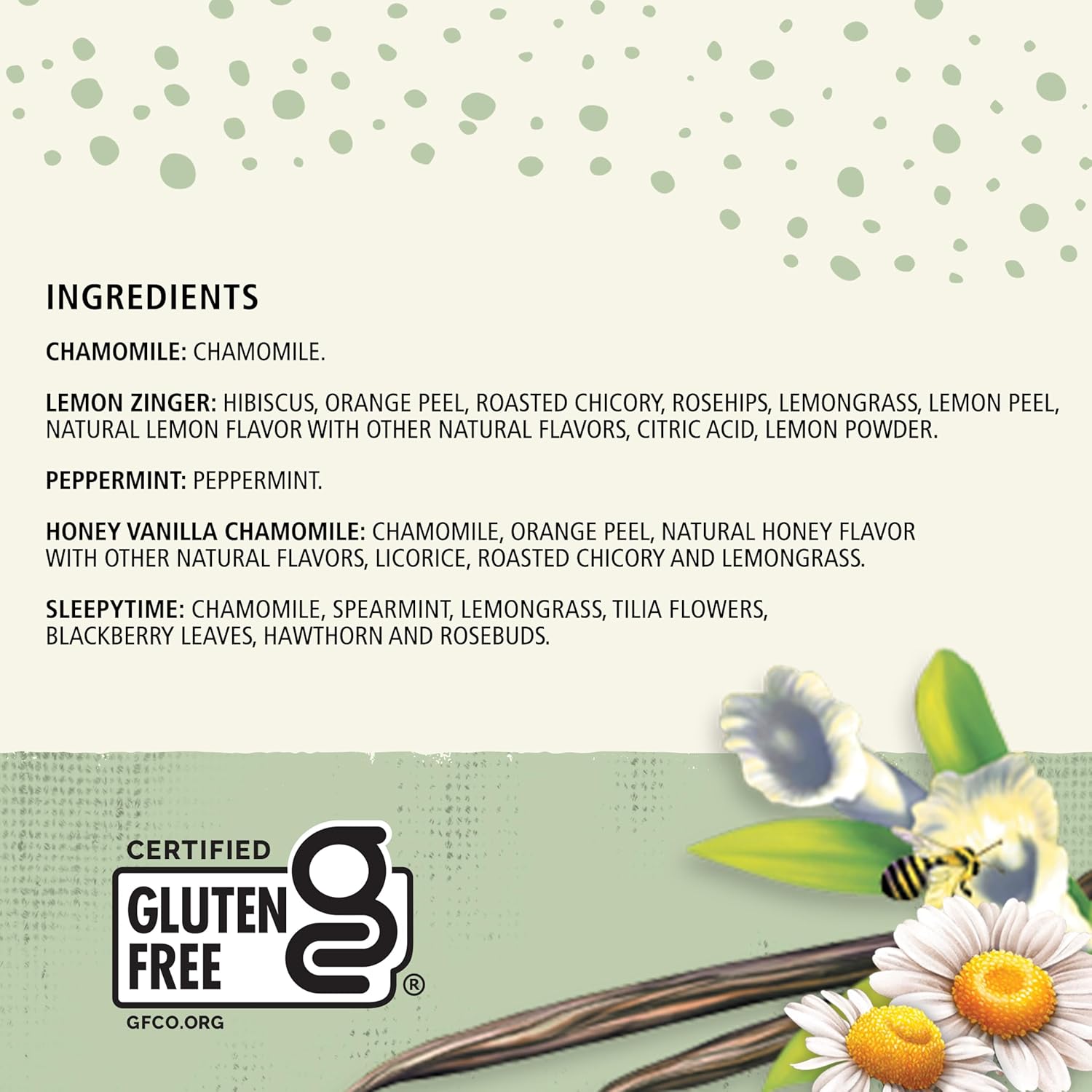 Herbal: Our herbal tea collection brings together five of our most comforting teas: Chamomile, Lemon Zinger, Peppermint, Honey Vanilla Chamomile, and Sleepytime.