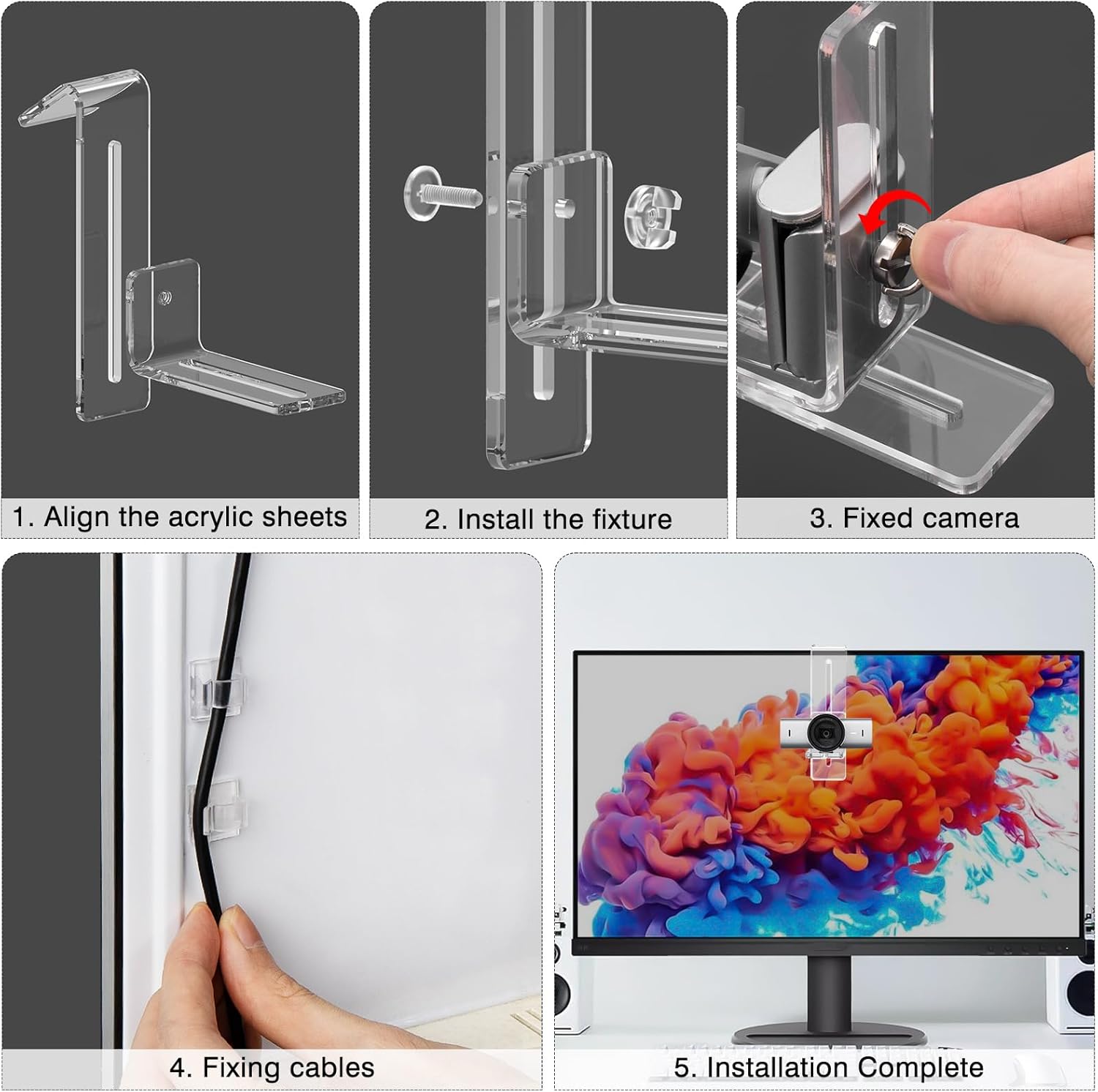 “Material”: Made of transparent acrylic, it ensures a clear view and makes your webcam appear to be floating in front of the screen.
