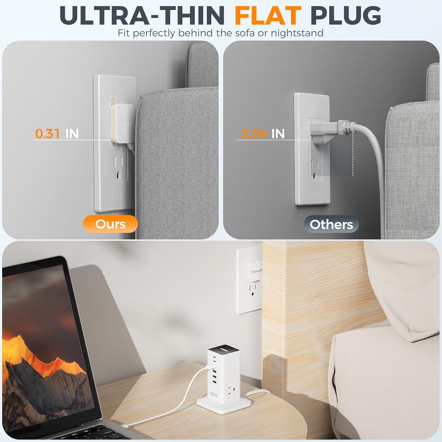 The ultra flat plug can keep the power cord close to the wall, making it easy to hide behind furniture, bed, refrigerator, and so onOur USB Charging Station for Multiple Devices with usb ports, it comes with 6 USB ports (2 USB-C ports) and 3 AC outlets , allowing you to use 9 devices simultaneously