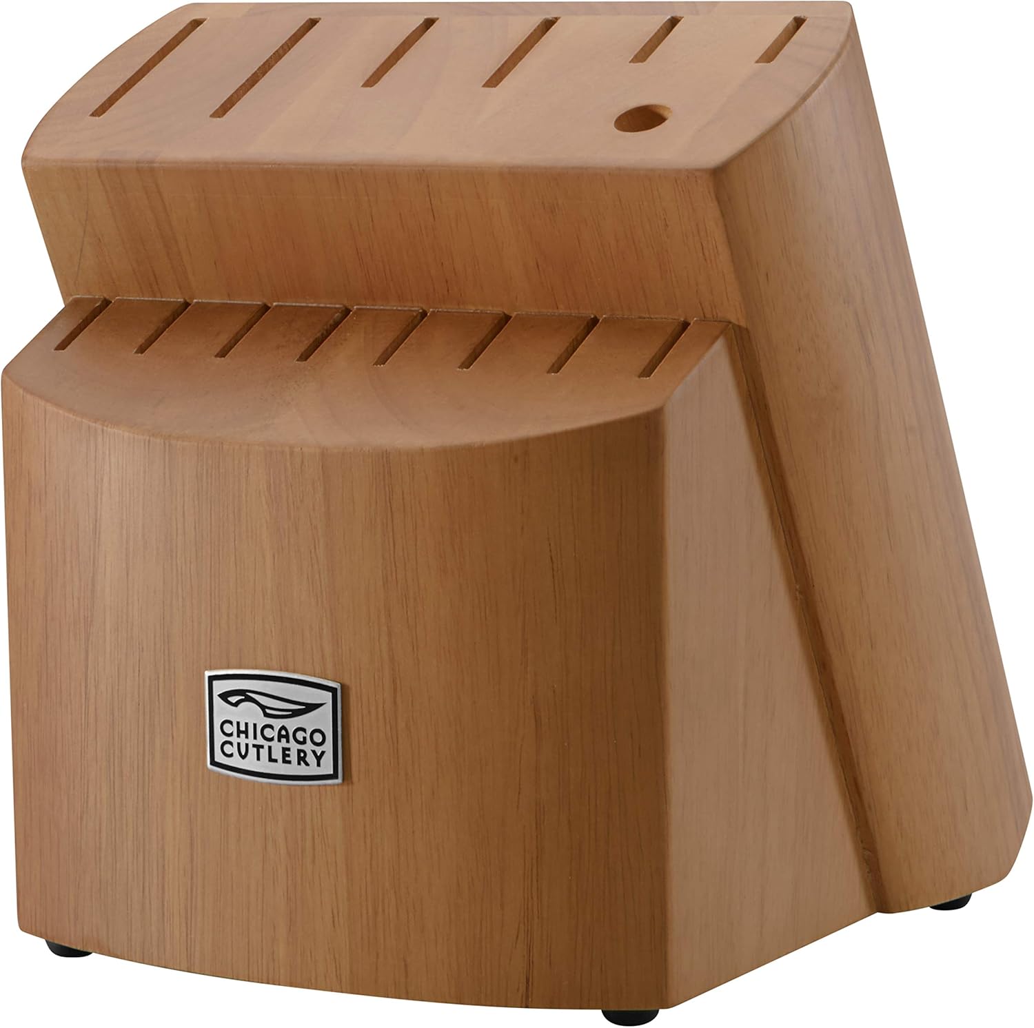 The padded, non-slip grip of our black poly–handled knives makes meal prep more comfortable. Carefully fitted with high quality Stainless Steel blades, they’re beautifully balanced and shaped for a multitude of kitchen Duties. Store in our wood block. The 17Piece set includes a 7-3/4″ Chef knife, 7-3/4″ Serrated bread knife, 7″ Santoku knife, 5″ Santoku knife, 5″ Utility knife, 3-D/4″ Paring knife, 4. 5″ Steak (8) knives, sharpening steel, chop assist and a chestnut-stain wood block.