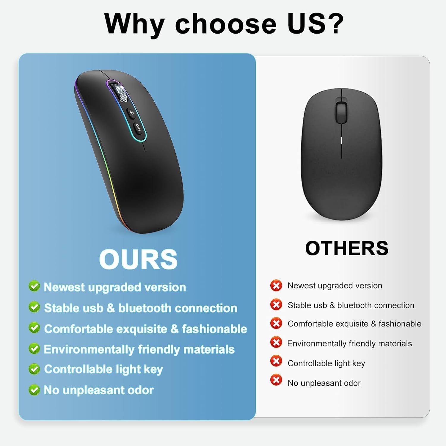 【Wireless Dual Mode Mouse】1 Mouse for 2 Devices — Duel technology of usb dongle and BT to improve work efficiency. Plug and play, no delays, no dropouts, stable connection with quick response and precise tracking, use distance up to 33 feet/10m