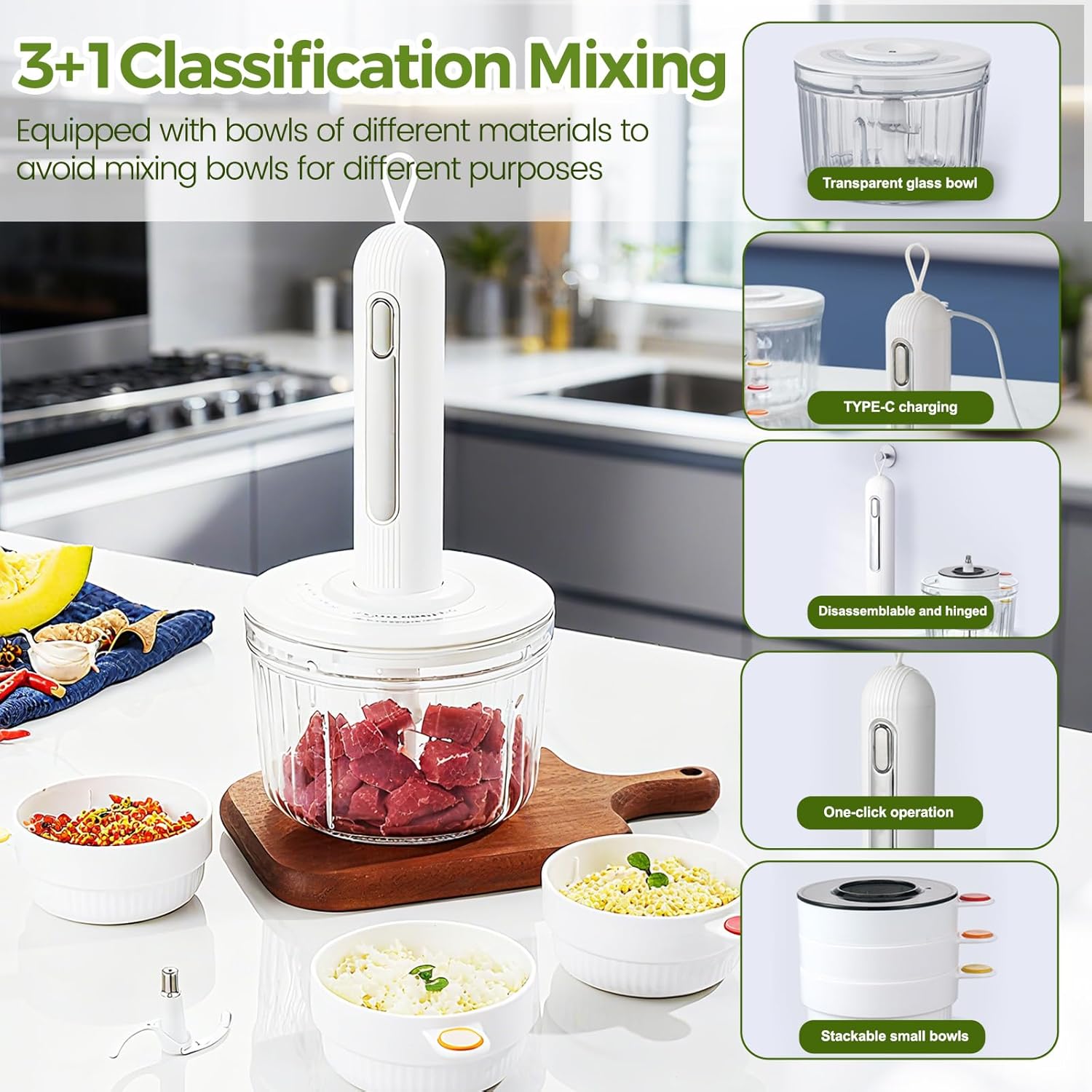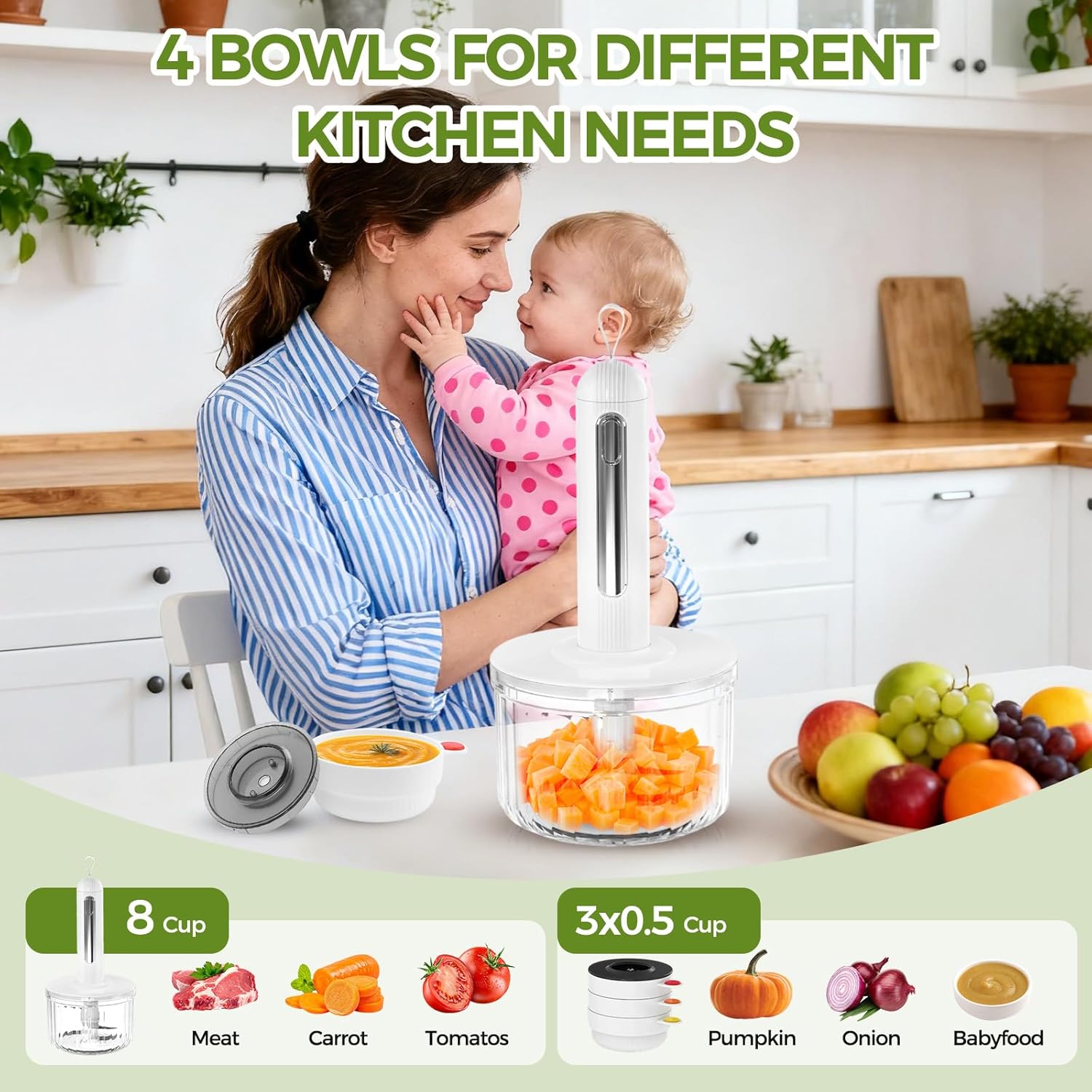 Includes 4 Bowls: Our small food processor comes with a large 1500ml bowl and three 100ml bowls, allowing you to handle different ingredients without mixing flavors, making meal prep convenient and efficient