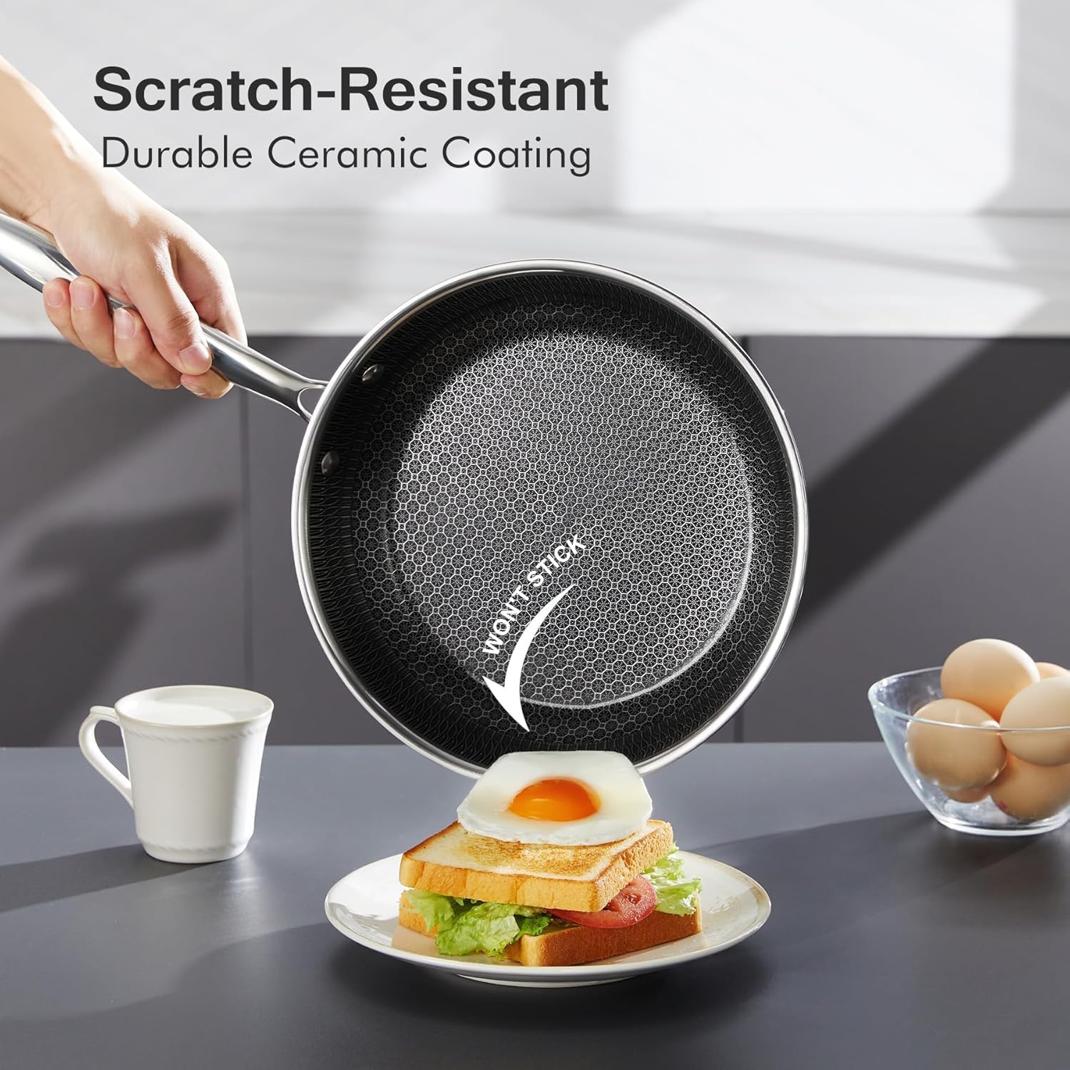 [MULTIPLY CLADDING TECHNOLOGY]: MultiPly cladding technology produces the highest-performing 3 ply stainless steel pots and pans set in your kitchen. Each layer of premium metal serves a purpose: 304 stainless steel for safe, easy-clean cooking; a thick aluminum core for even heating; and 18/0 stainless steel for performance on all cooktops. USELUCK patented hybrid tech, Featuring a cutting-edge enhanced nonstick coating, our non stick frying pans set offers longer-lasting, superior non-stick performance.