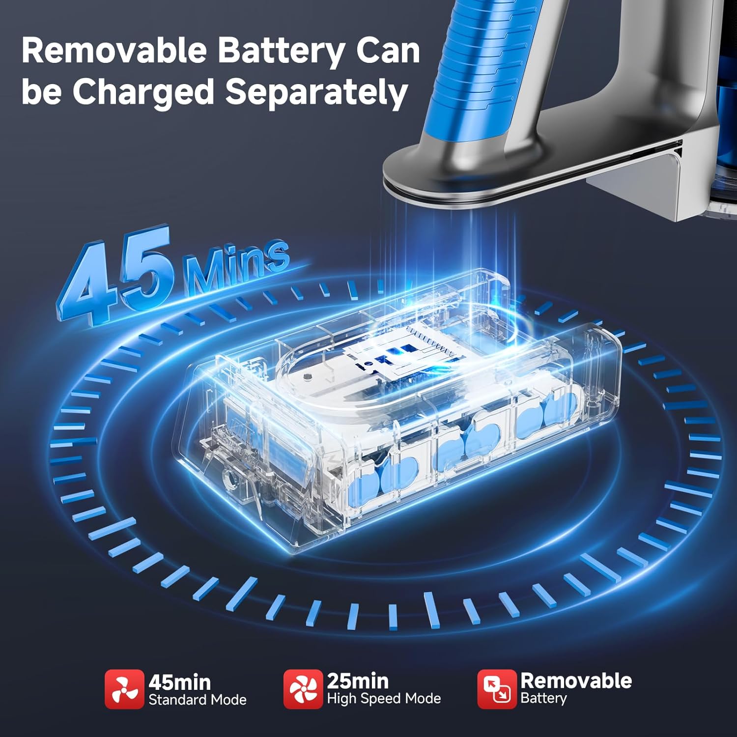 🔋 【Long-Lasting Battery & Quick Charging】Enjoy extended cleaning sessions with the high-capacity lithium-ion battery. This rechargeable vacuum cordless provides up to 45 minutes of continuous runtime in standard mode, perfect for whole-house cleaning. The vacuum cleaner cordless recharges fully within 4 hours and features battery level indicators. The cordless vacuum cleaners for home use is engineered for maximum energy efficiency without compromising suction performance.