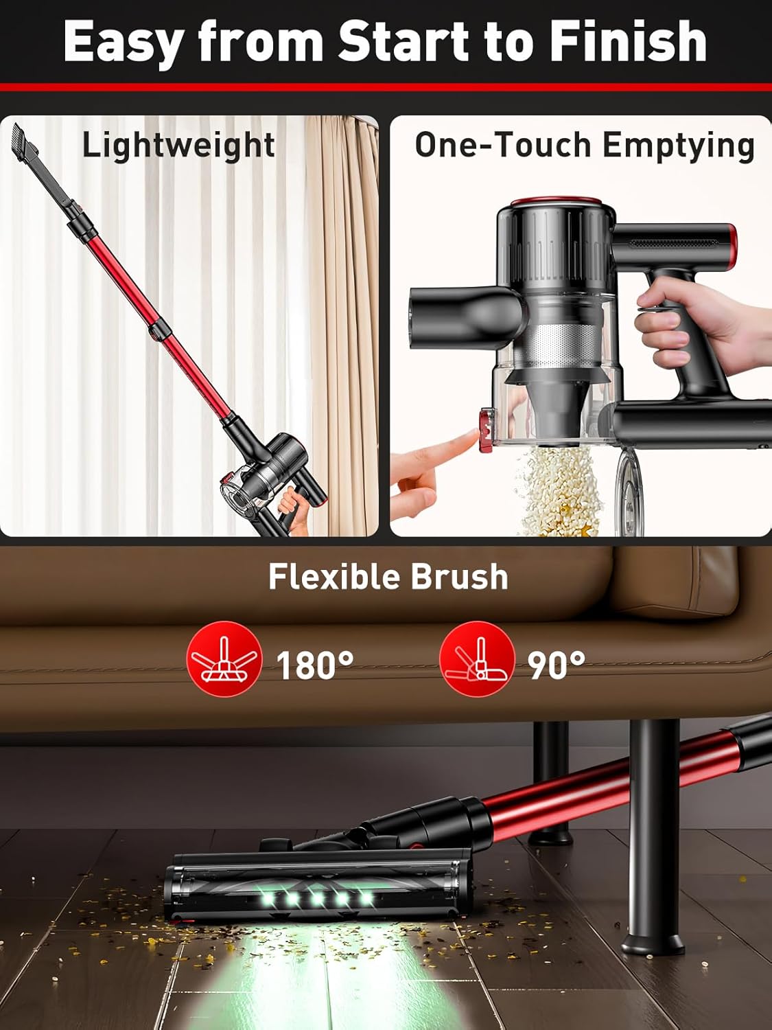 [Tangle-Free V-Brush & LED Floor Head] Pet hair vacuum with anti-tangle V-shaped floor brush lifts hair and dust without winding, ideal for homes with pets. 270° flexible swivel and 5 LED headlights ensure no spot is missed—even under beds, couches, and dark corners. Designed for complete floor-to-ceiling cleaning.