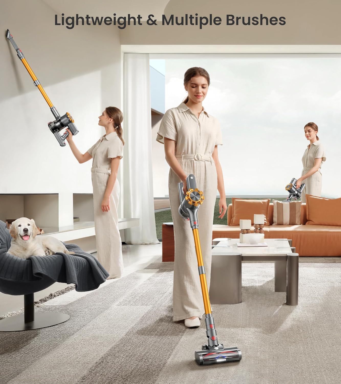【Powerful Suction & Long Runtime】This powerful cordless vacuum cleaner is equipped with a 500W high-efficiency motor that delivers strong 45KPa suction power. The vacuum cleaners for home features a high-performance lithium battery with dual-mode operation (MIN/MAX): MIN Eco Mode delivers up to 60 minutes runtime, perfect for daily quick cleaning of entire hard floors to maintain home cleanliness. MAX Power Mode offers 20-25 minutes of intensive cleaning, effectively removing deep-seated dust from carpets and stubborn pet hair for thorough deep-cleaning performance.