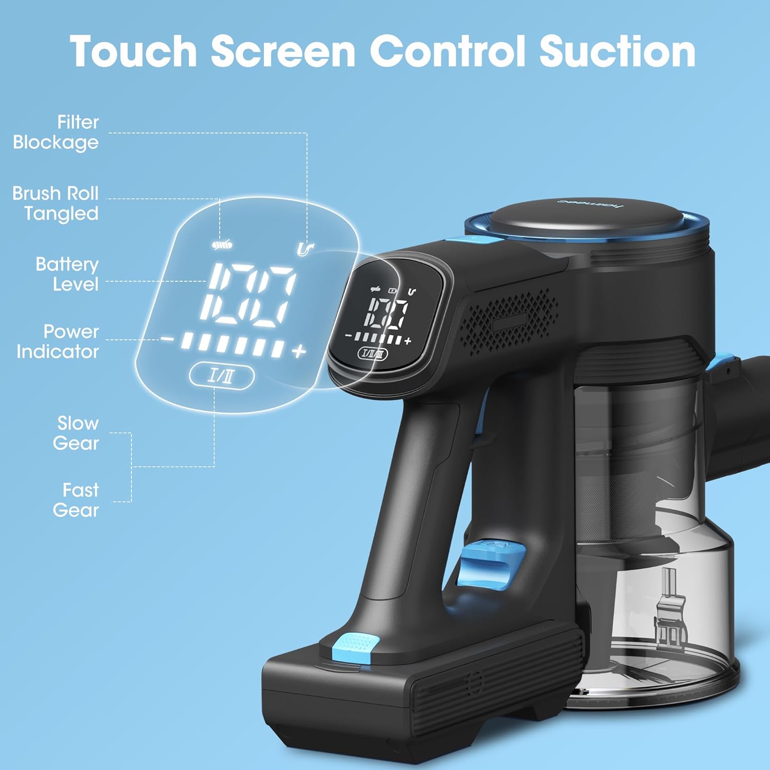 【IQ LED Touch Display】 Get the information of cordless vacuum cleaner performance in real time, includes real-time readouts on runtime, floor brush operating status, power mode. And you can adjust the power mode of the vacuum cleaner by touch screen.