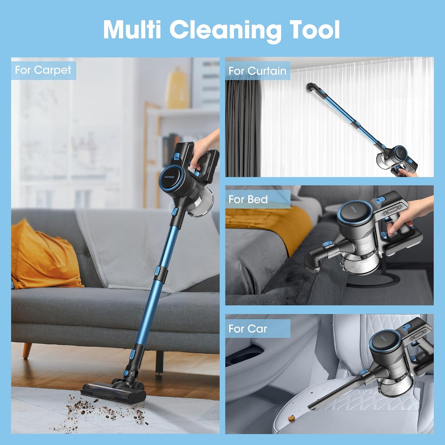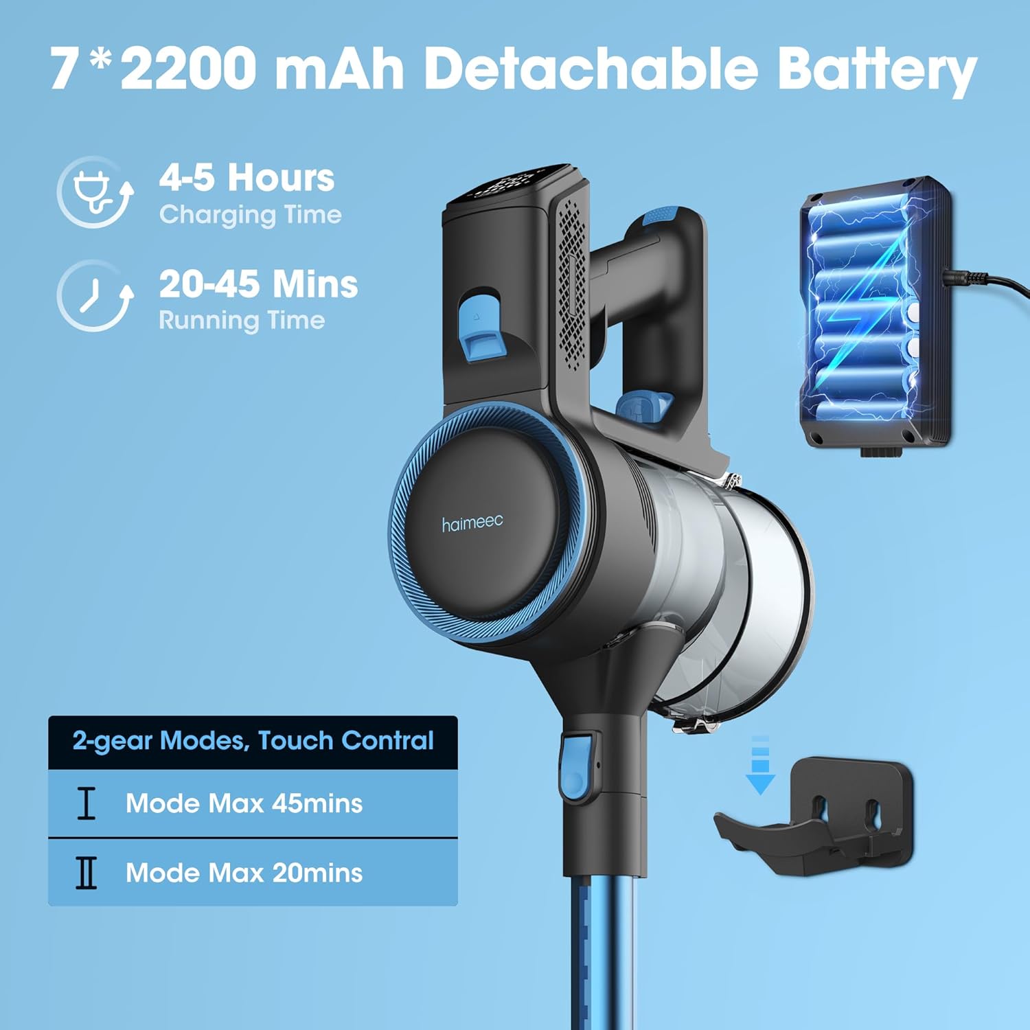 【Upgraded Battery Long Runtime】 HAIMEEC cordless Stick vacuum comes with removable rechargeable battery, delivers up to 20(Max mode)-45(Eco mode) minutes run time depending on your mode, Ideal for whole house work.