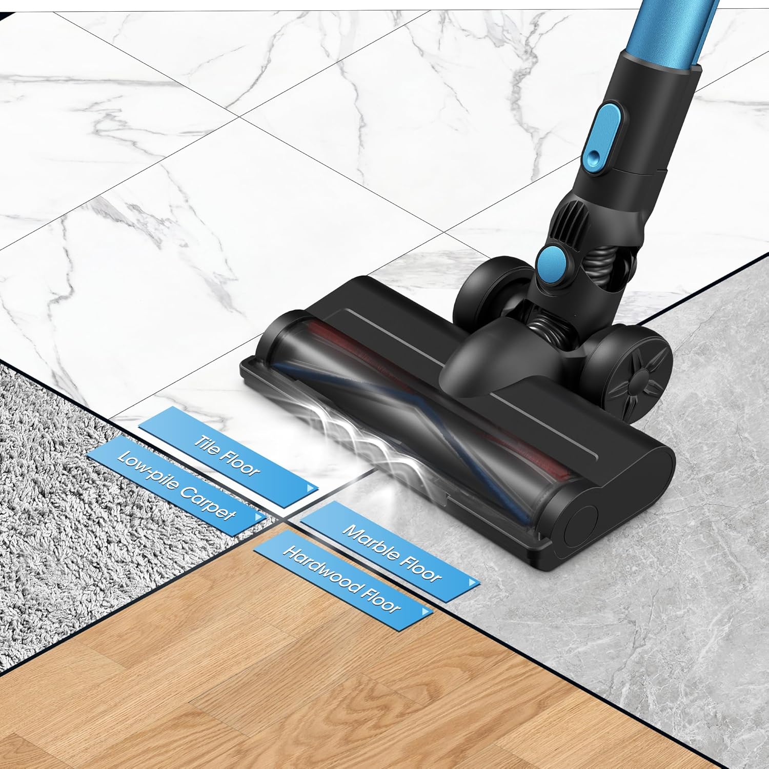 【2 Powerful Suction Modes】 HAIMEEC 6-in-1 cordless vacuum cleaner has 2 speed levels, allowing you to easily switch between the highest mode, the standard mode. Meet your various cleaning needs of pet hair, fine dust, crumbs, large particles on hardwood floors, tile floors, marble floors and low pile carpets, etc.