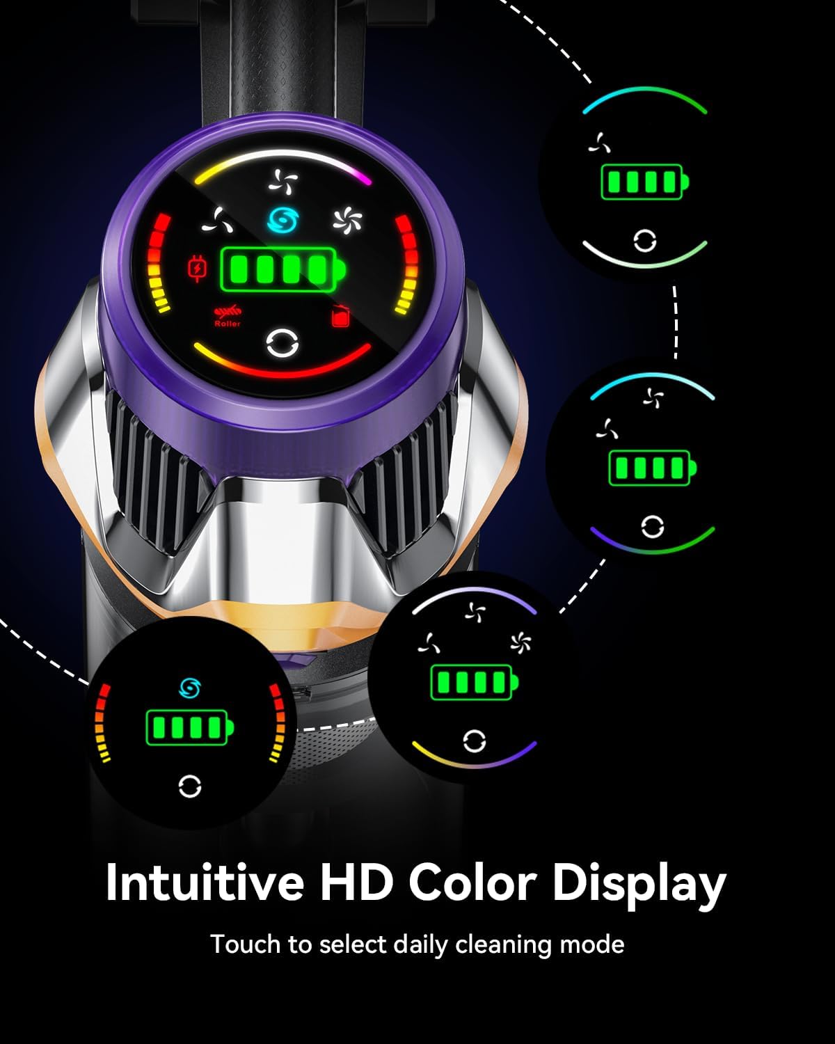 [High-Definition Color LED Display]: Adjust suction power effortlessly with the responsive touchscreen. Its oversized, high-resolution icons are intuitively designed for easy use by everyone, including those who are nearsighted or elderly. The panel displays real-time battery status to help you plan your cleaning, and will alert you instantly if maintenance is required. Everyone can enjoy the convenience and fun of smart cleaning!
