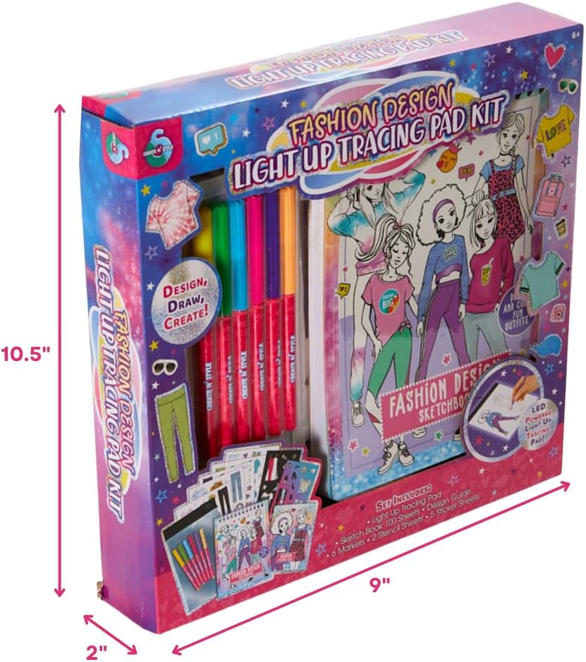 The Create N’ Style Fashion Design Light Up Tracing Pad Kit is the ultimate activity set for aspiring fashion designers. With this kit, kids can easily learn to draw and create their own fashion pieces using the LED-powered light-up tracing pad. By simply tracing designs from the included guide, they can bring their fashion ideas to life and color them in with the six included markers, or use their own colored pencils or crayons. The kit includes everything needed for hours of fun, including a 100-sheet sketchbook, 2 stencil sheets, and 5 sticker sheets with over 100 fashion-themed stickers. These stickers can be used to embellish art projects, paper crafts, or even water bottles and binders. Designed for kids ages 6 and up, this creative set is perfect for sharing with friends and makes learning to draw easy and enjoyable. Whether at home, school, or on the go, this fashion design kit offers endless fun and creativity, making it a fantastic gift for girls who love to doodle and design, whether for birthdays, holidays, or special occasions.