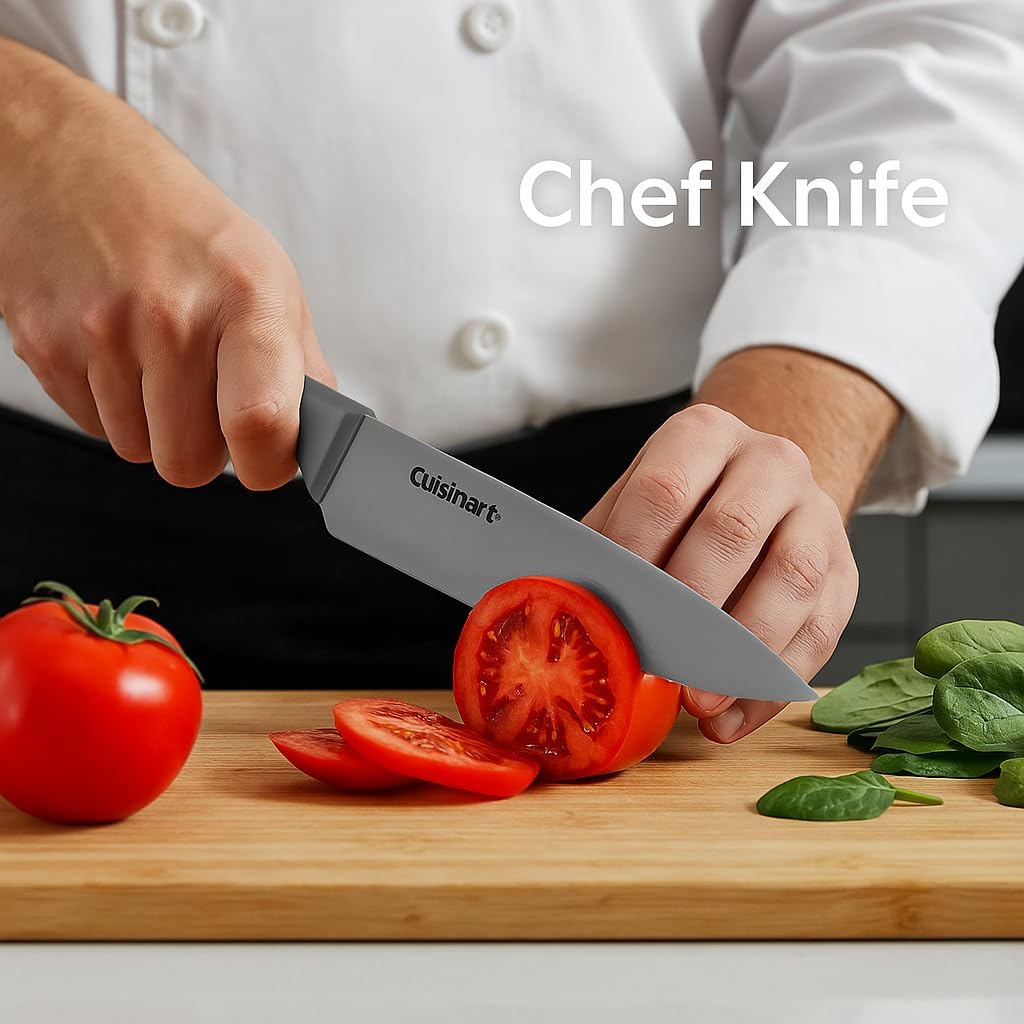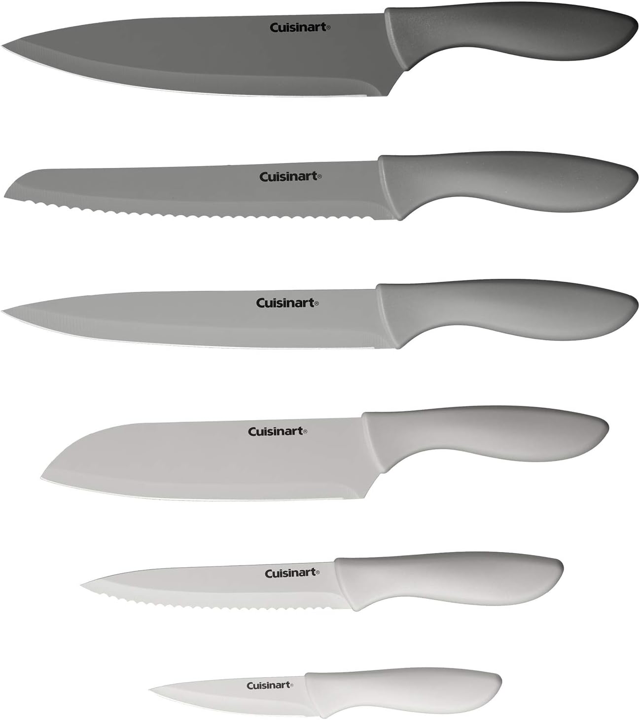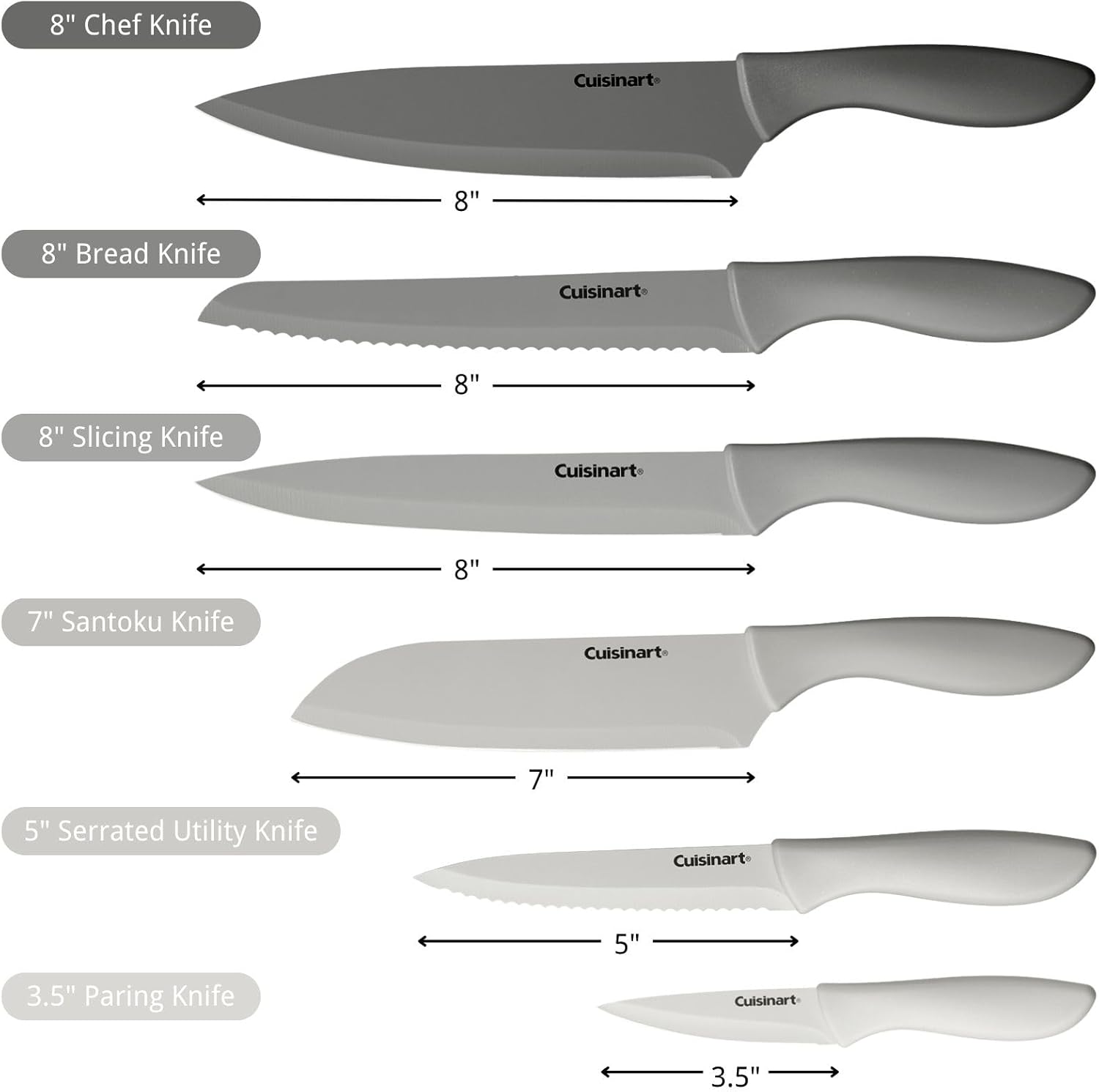 Cuisinart Advantage professional-quality stainless steel knives each have a cutting-edge and ceramic coating. These premium knives come with blade guards and feature ergonomic handles.Product Features:High-quality stainless steel blades ceramiccoating Lifetime warranty from CuisinartIncludes:8″ Chef Knife8″ Slicing Knife8″ Serrated Bread Knife7″ Santoku Knife6.5″ Utility Knife3.5″ Paring KnifeGuards for all knives