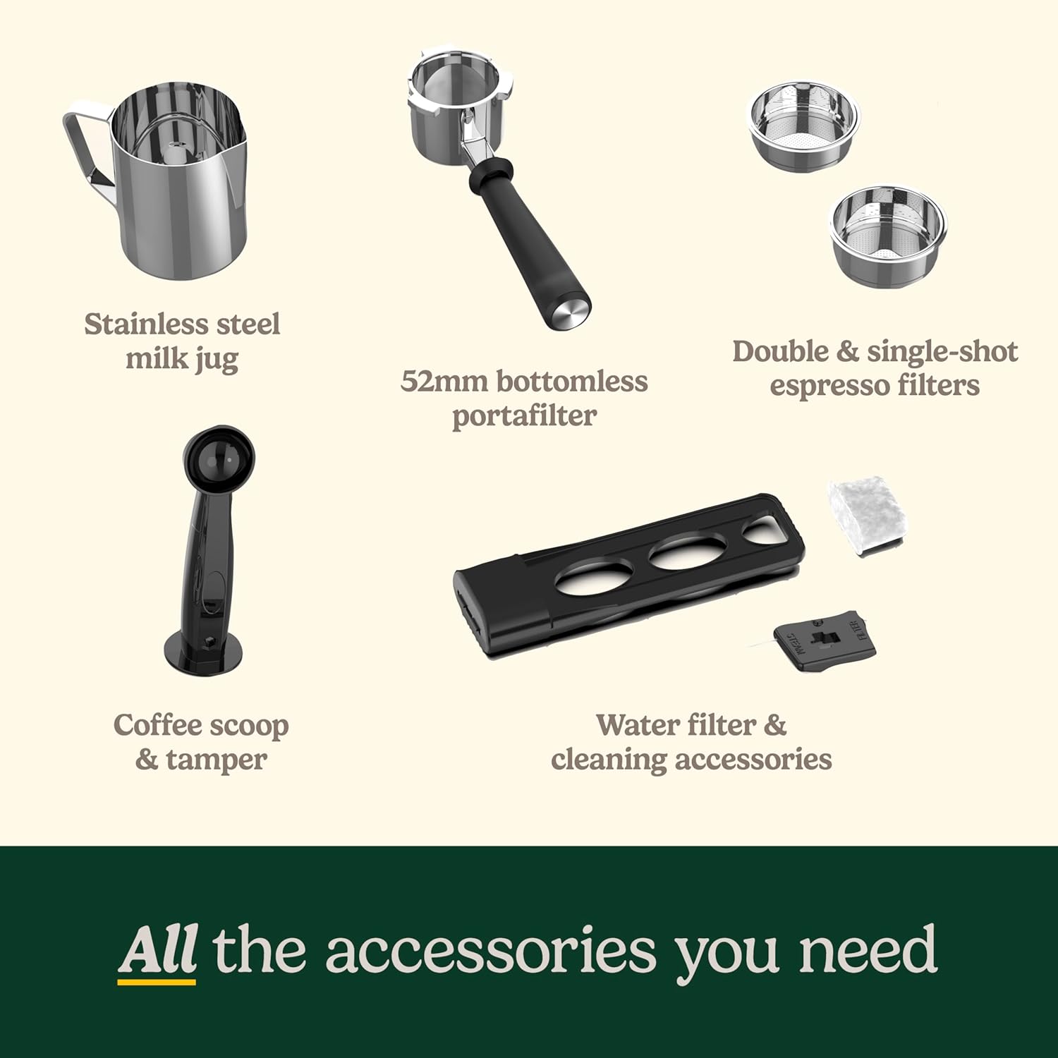 BOTTOMLESS PORTAFILTER: This cappuccino machine espresso maker features a 52 mm stainless steel bottomless portafilter and up to 15 bars of pressure for balanced extraction so you can adjust and perfect your shot.