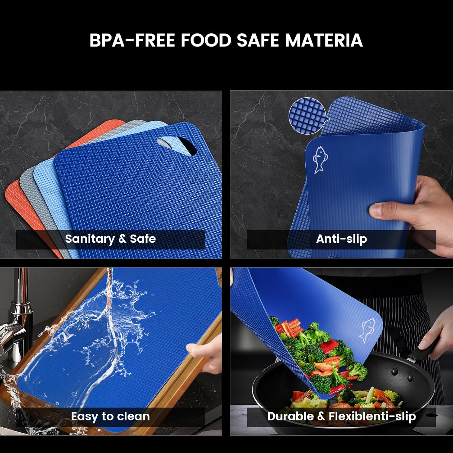 [Get Efficiency and Protection with Cutting Board Mat] Our colorful plastic cutting board mats, constructed from food-safe grade PP material, offers flexibility and a non-slip surface. The high-density plastic material is dishwasher-safe, ensuring effortless cleanup. Furthermore, it can be easily rolled up, providing reliable stability when transferring food. The non-slip cutting board mat on the front of the butcher block fits securely, preventing sliding and knife scratches