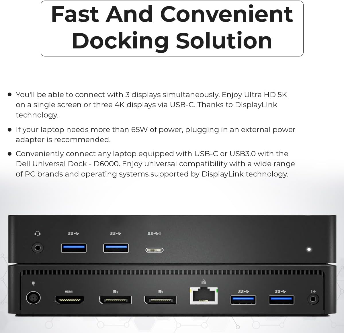 [Package Includes] – Dell Dock D6000 130W Renewed, 1x USB Type-C Cable, 1x HDMI Cable, 1x Displayport Cable, Dell 130W Power Adapter, Microfiber Cleaning Cloth