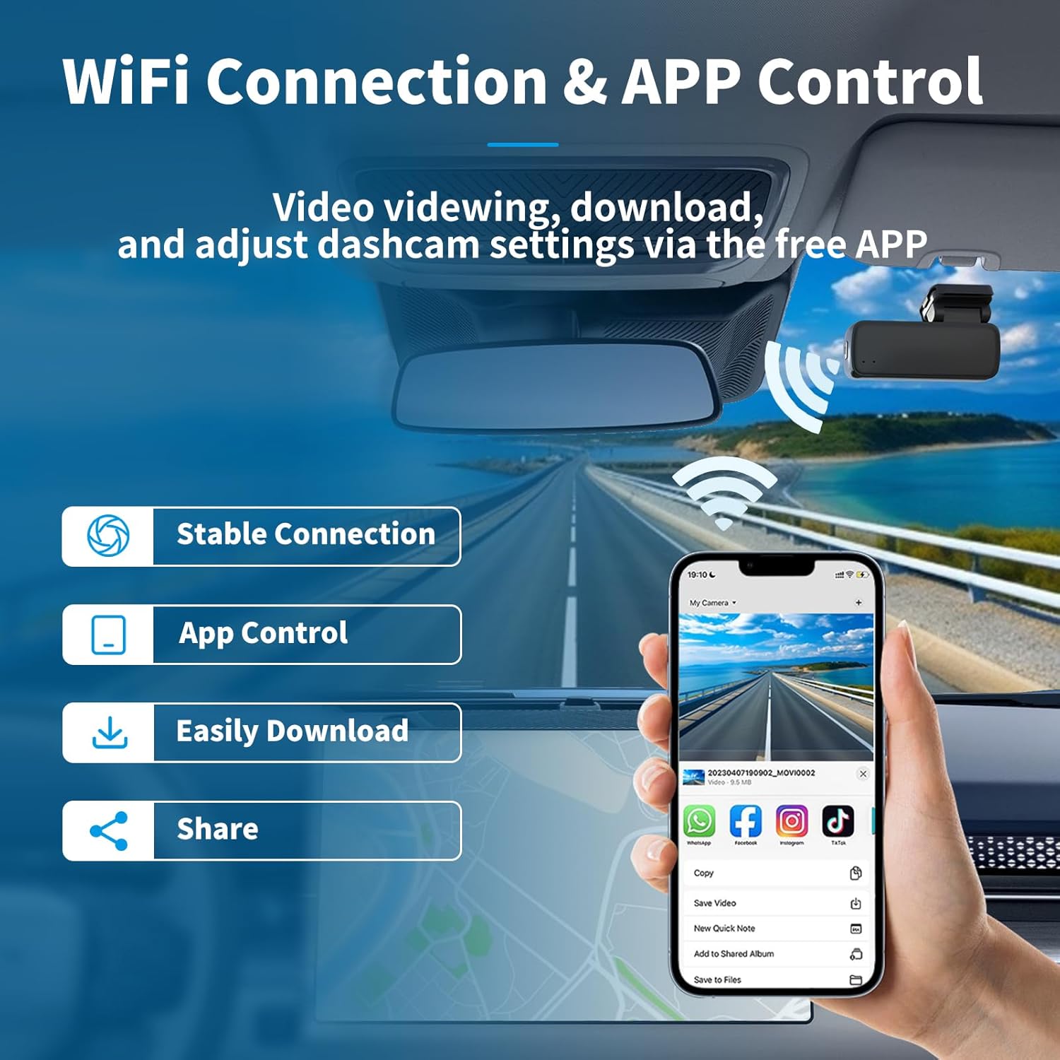 Built-in Wi-Fi & Free App: Simply connect the wifi car dash cam to your smartphone app via Wi-Fi for easy control and management. View real-time footage, download videos, and adjust settings directly from your phone. Share your travel moments effortlessly with friends and family. (Note: CarPlay and Android Auto may interfere with the connection—please disconnect them when using the app.)