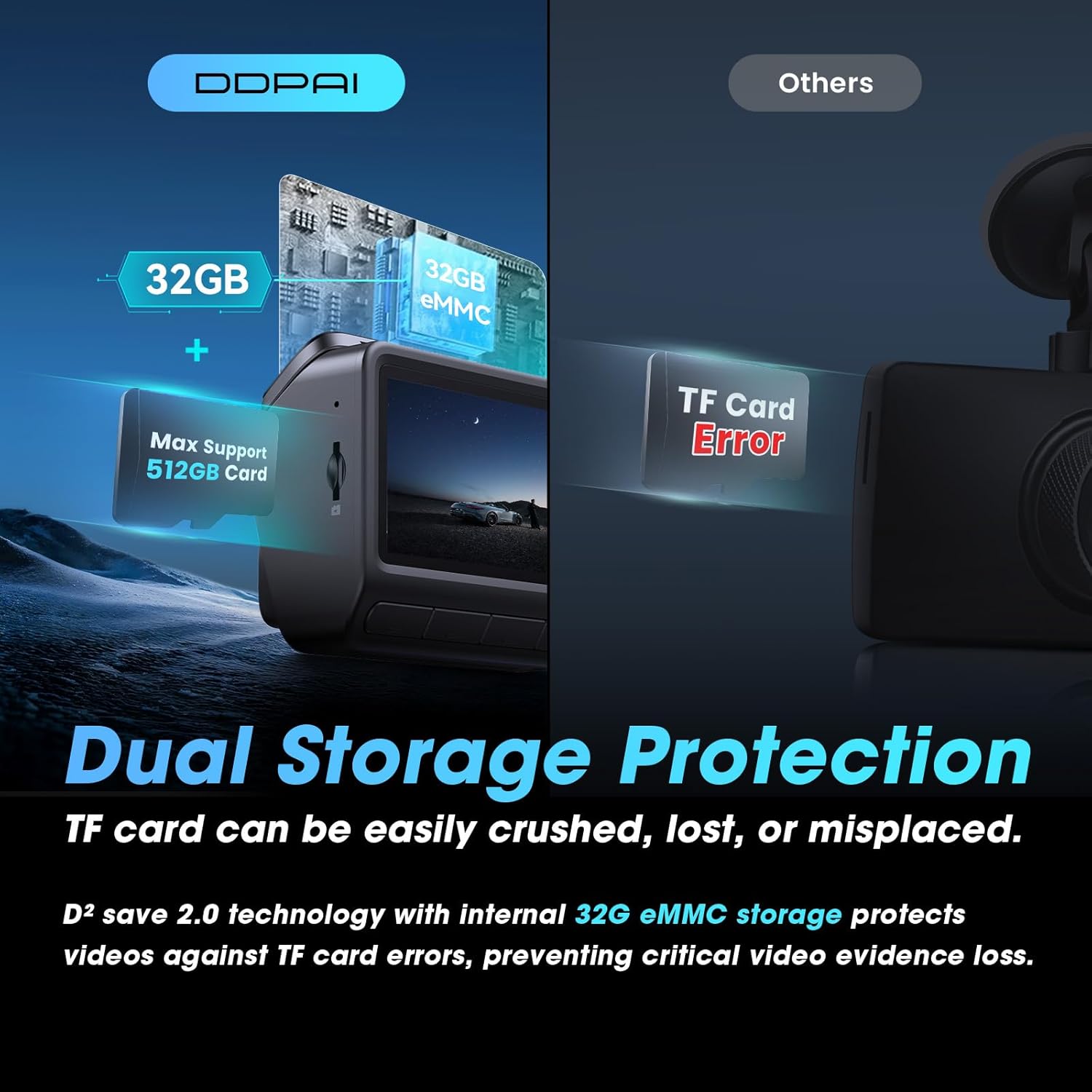 【Built-in 32GB eMMC for Dual Storage Protection】With DDPAI’s D²Save 2.0 technology, this dashcam front and rear camera comes with 32GB eMMC internal storage and supports an additional TF card (up to 512GB). If your TF card becomes damaged, lost, or misplaced, recordings will automatically switch to internal storage, ensuring no critical video evidence is lost. Note: The TF card is Not included.