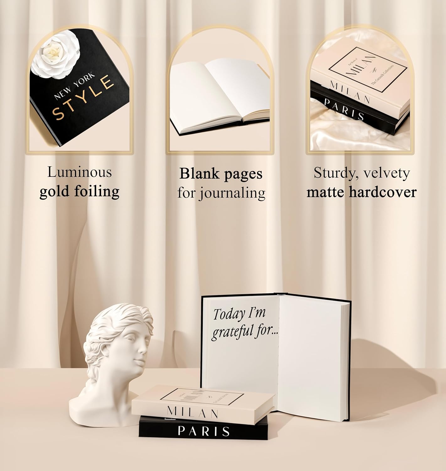 WHAT’S INCLUDED: 1 Paris book in black, 1 Milan book in a beautiful beige cream tone, 1 New York book in black with gold-lettered foiling ABOUT US: We at Blossoma believe that luxury should be accessible to everyone. Because of this philosophy, we are on a dedicated mission to create glamorous products of the utmost quality and at a fair, affordable price. Every step of this process thus far has been designed and created by women from all over the world to bring you products that support your happiness, creativity and beauty! 30-DAY RETURN POLICY: Thank you from the bottom of our hearts for visiting and supporting our brand. Customer satisfaction is our top priority so please contact us for questions or if our product doesn’t absolutely live up to your expectations. We care and will try our best to make things right so that you are 100% satisfied.