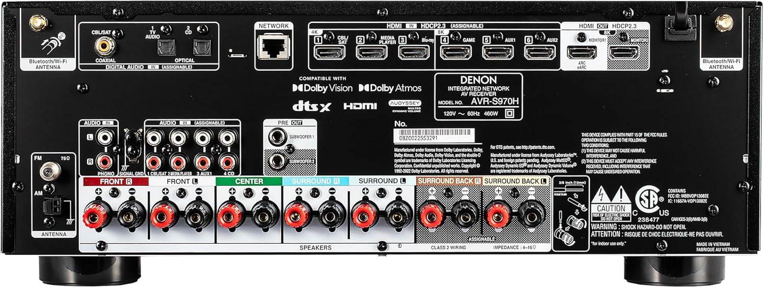Elevate your home entertainment with the Denon AVR-S970H 7.2-Channel Network A/V Receiver, designed to deliver powerful surround sound and ultra-high-definition visuals. Whether you’re setting up a traditional 7.2-channel system or aiming for a more immersive experience with a 5.2.2 configuration, this receiver ensures movies, TV shows, and music come to life in any room. The S970H supports 8K/60Hz passthrough via three of its six HDMI inputs, along with one of its two outputs, providing superior video quality with compatibility for HDR10, HDR10+, and Dolby Vision. For audiophiles, this receiver offers Hi-Res Audio playback via the front USB-A port or through wireless streaming using Wi-Fi, Bluetooth, or Ethernet. Gaming enthusiasts will appreciate the enhanced gaming experience, with features like VRR, QFT, and ALLM ensuring ultra-smooth, responsive gameplay. The receiver supports multi-room audio streaming with built-in wireless functionality, allowing music to be enjoyed across the home via compatible speakers. The Denon Setup Assistant simplifies the setup process, while Audyssey room calibration ensures your sound is tailored perfectly to your space. The Bluetooth transmitter allows you to enjoy audio through wireless headphones while others can listen through the speakers. With features like Quick Select buttons, dual subwoofer outputs, and voice control, the AVR-S970H is the ideal centerpiece for any modern home theater system.