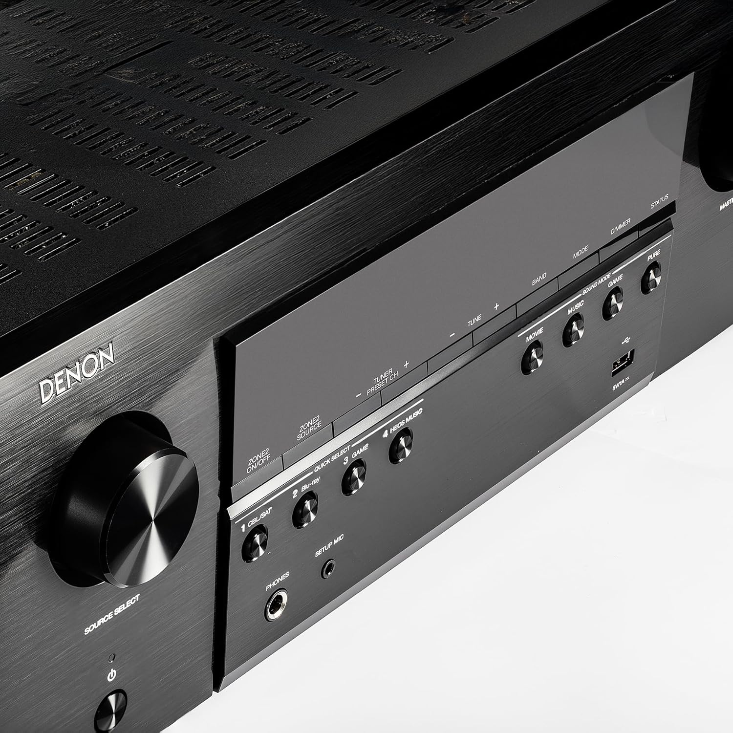 Calibrate sound with Audyssey room measurement, stream to Bluetooth headphones, and control the system with Quick Select buttons, Denon AVR Remote app, or voice assistants. Includes dual subwoofer outputs and AM/FM radio.