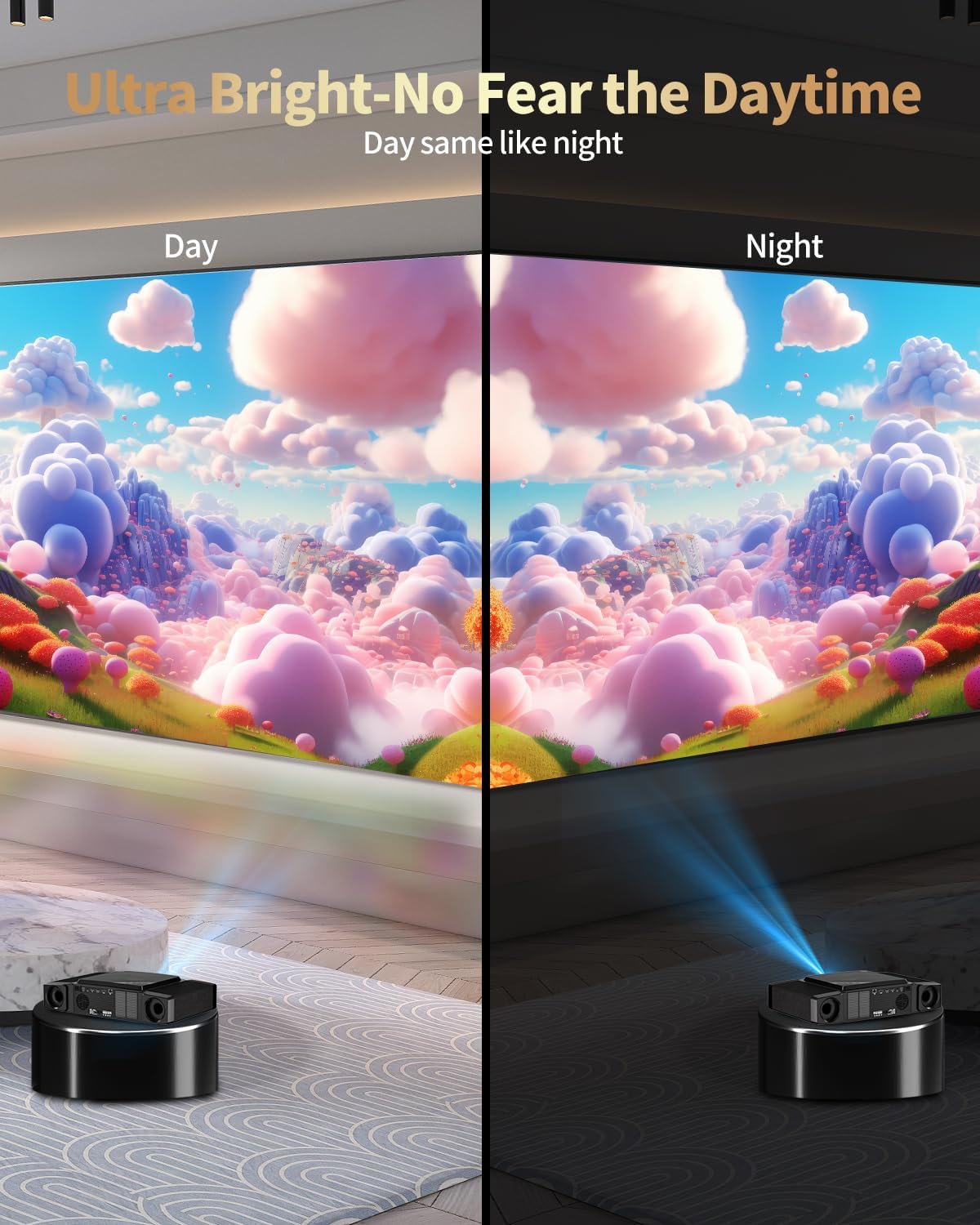 【2500 Brightness Upgraded for Clear Day and Night】The brightness of the new generation LED light source has been increased by 50%, combined with 4K ultra clear resolution and HDR10 dynamic picture quality compensation. The details are clear and the colors are accurately restored. The three brightness modes have lower power consumption in energy-saving mode and smaller sound. Equipped with intelligent brightness compensation algorithm, there is no pressure to watch movies during the day in high brightness mode! Whether it’s action movies, sports events, or game graphics, every frame is vividly displayed!